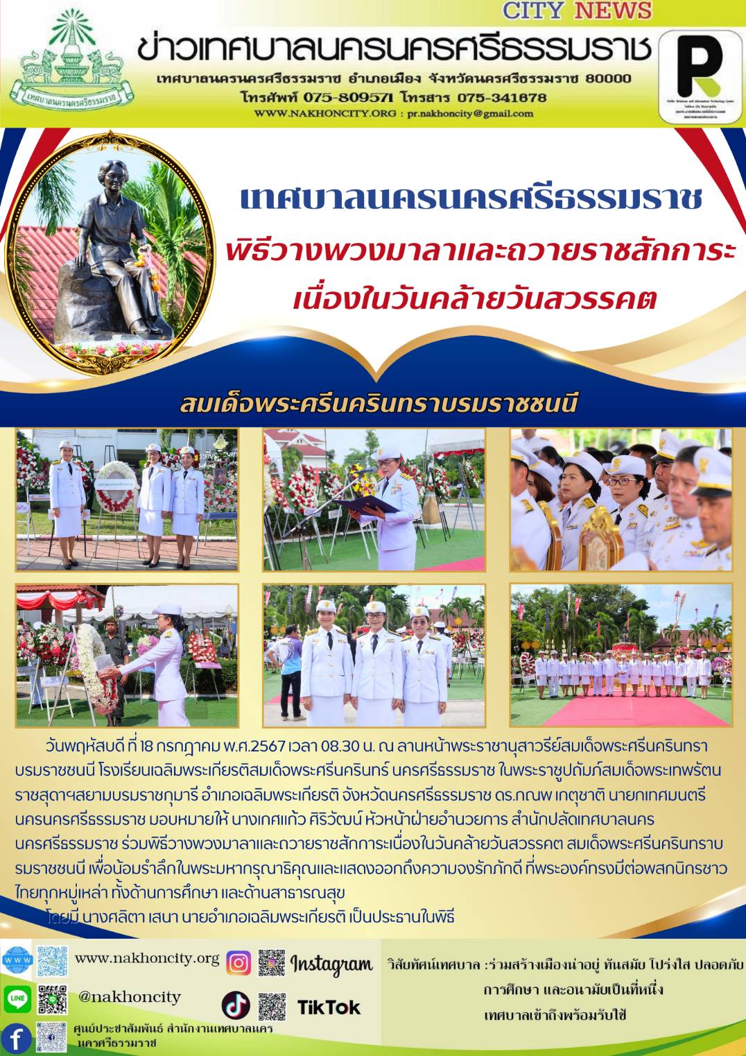 | ดร.กณพ เกตุชาติ นายกเทศมนตรีนครนครศรีธรรมราช มอบหมายให้ นางเกศแก้ว ศิริวัฒน์ หัวหน้าฝ่ายอำนวยการ สำนักปลัดเทศบาลนครนครศรีธรรมราช ร่วมพิธีวางพวงมาลาและถวายราชสักการะเนื่องในวันคล้ายวันสวรรคต สมเด็จพระศรีนครินทราบรมราชชนนี |