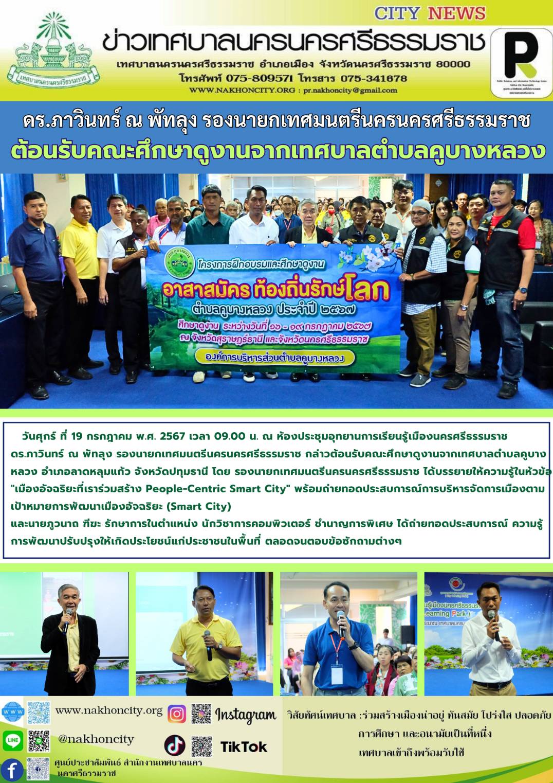 | วันศุกร์ ที่ 19 กรกฎาคม พ.ศ. 2567 เวลา 09.00 น. ณ ห้องประชุมอุทยานการเรียนรู้เมืองนครศรีธรรมราช ดร.ภาวินทร์ ณ พัทลุง รองนายกเทศมนตรีนครนครศรีธรรมราช กล่าวต้อนรับคณะศึกษาดูงานจากเทศบาลตำบลคูบางหลวง อำเภอลาดหลุมแก้ว จังหวัดปทุมธานี โดย รองนายกเทศมนตรีนครนครศรีธรรมราช ได้บรรยายให้ความรู้ในห้วข้อ "เมืองอัจฉริยะที่เราร่วมสร้าง People-Centric Smart City" พร้อมถ่ายทอดประสบการณ์การบริหารจัดการเมืองตามเป้าหมายการพัฒนาเมืองอัจฉริยะ (Smart City) และนายภูวนาถ ฑีฆะ รักษาการในตำแหน่ง นักวิชาการคอมพิวเตอร์ ชำนาญการพิเศษ ได้ถ่ายทอดประสบการณ์ ความรู้ การพัฒนาปรับปรุงให้เกิดประโยชน์แก่ประชาชนในพื้นที่ ตลอดจนตอบข้อซักถามต่างๆ …………. ภาพ//ข่าว//จันทร์จิรา |