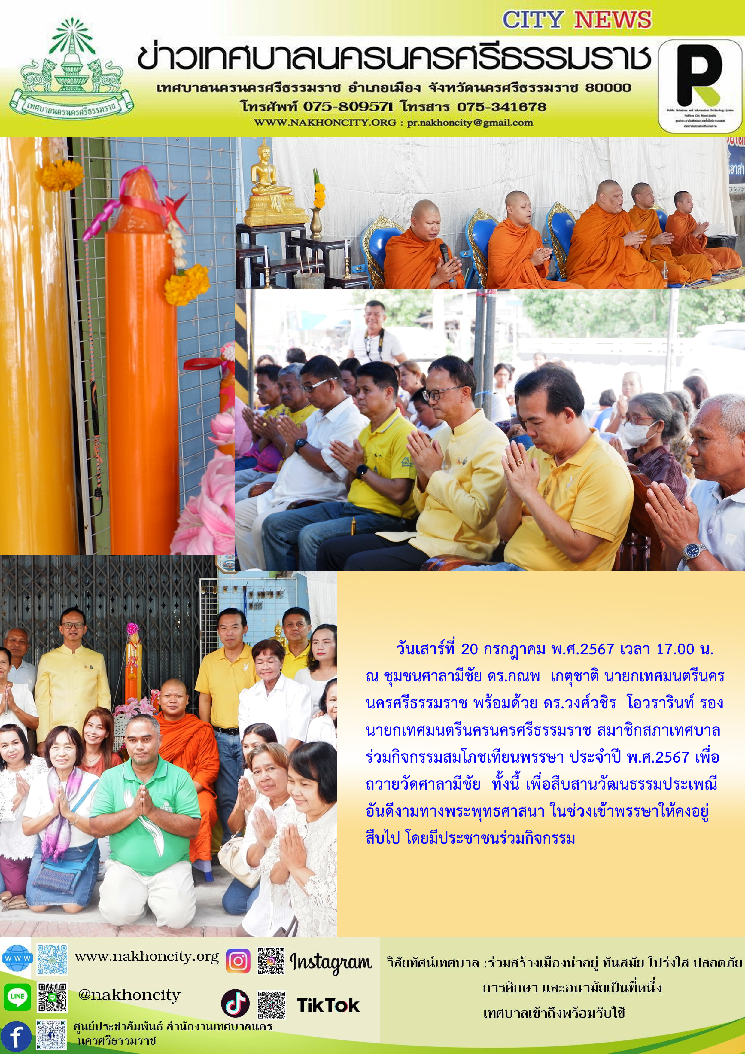 | วันเสาร์ที่ 20 กรกฎาคม พ.ศ.2567 เวลา 17.00 น. ณ ชุมชนศาลามีชัย ดร.กณพ เกตุชาติ นายกเทศมนตรีนครนครศรีธรรมราช พร้อมด้วย ดร.วงศ์วชิร โอวรารินท์ รองนายกเทศมนตรีนครนครศรีธรรมราช สมาชิกสภาเทศบาล ร่วมกิจกรรมสมโภชเทียนพรรษา ประจำปี พ.ศ.2567 เพื่อถวายวัดศาลามีชัย ทั้งนี้ เพื่อสืบสานวัฒนธรรมประเพณี อันดีงามทางพระพุทธศาสนา ในช่วงเข้าพรรษาให้คงอยู่สืบไป โดยมีประชาชนร่วมกิจกรรม |