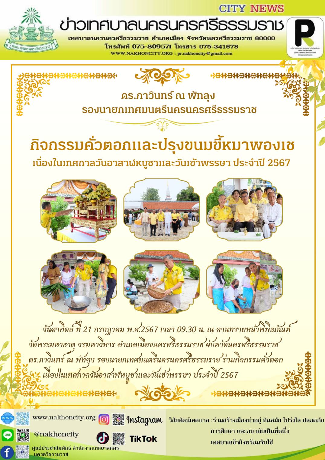 | ดร.ภาวินทร์ ณ พัทลุง รองนายกเทศมนตรีนครนครศรีธรรมราช ร่วมกิจกรรมคั่วตอก เนื่องในเทศกาลวันอาสาฬหบูชาและวันเข้าพรรษา ประจำปี 2567 |