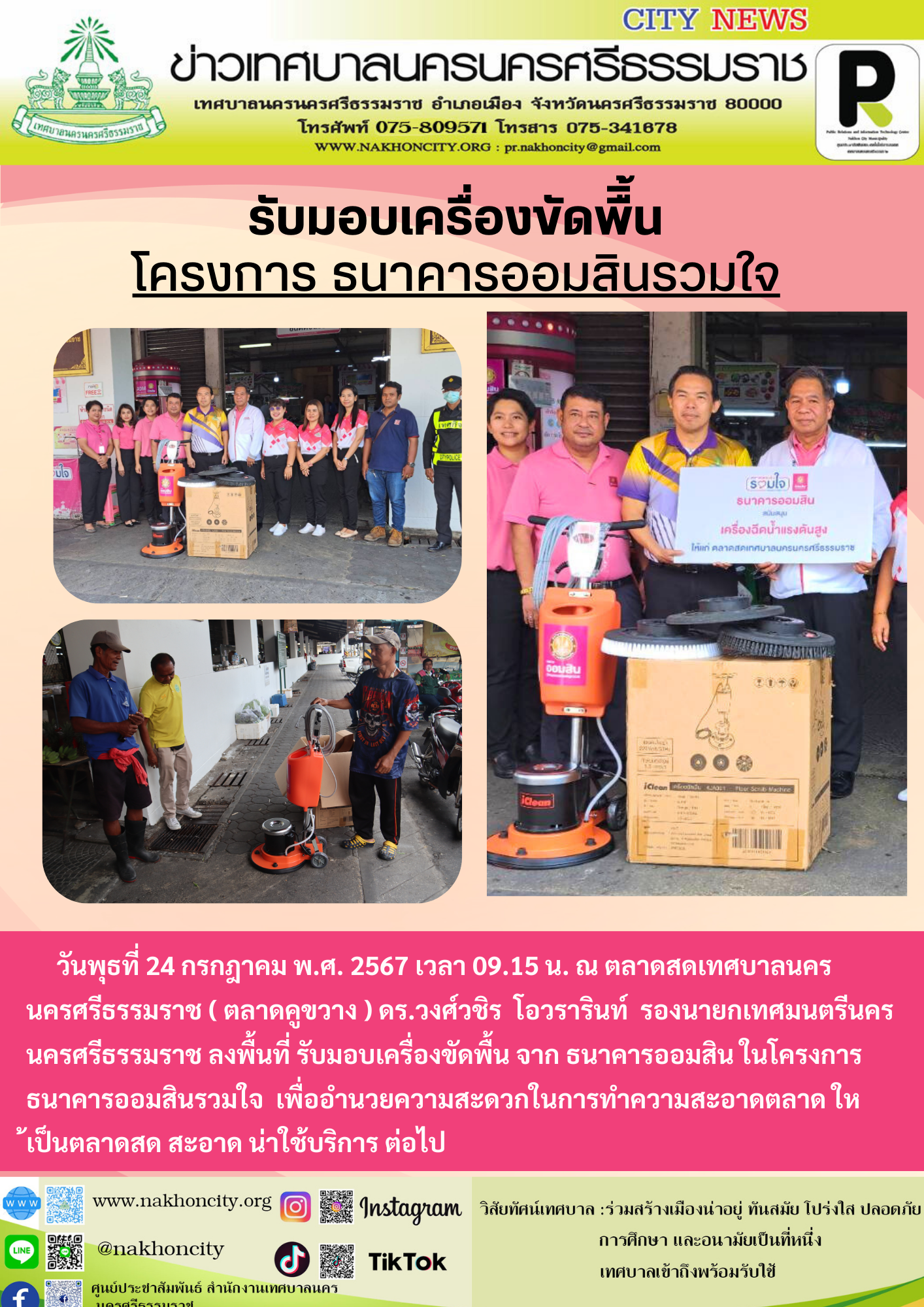 | วันพุธที่ 24 กรกฎาคม พ.ศ. 2567 เวลา 09.15 น. ณ ตลาดสดเทศบาลนครนครศรีธรรมราช ( ตลาดคูขวาง ) ดร.วงศ์วชิร โอวรารินท์ รองนายกเทศมนตรีนครนครศรีธรรมราช ลงพื้นที่ รับมอบเครื่องขัดพื้น จาก ธนาคารออมสิน ในโครงการ ธนาคารออมสินรวมใจ เพื่ออำนวยความสะดวกในการทำความสะอาดตลาด ให้เป็นตลาดสด สะอาด น่าใช้บริการ ต่อไป |