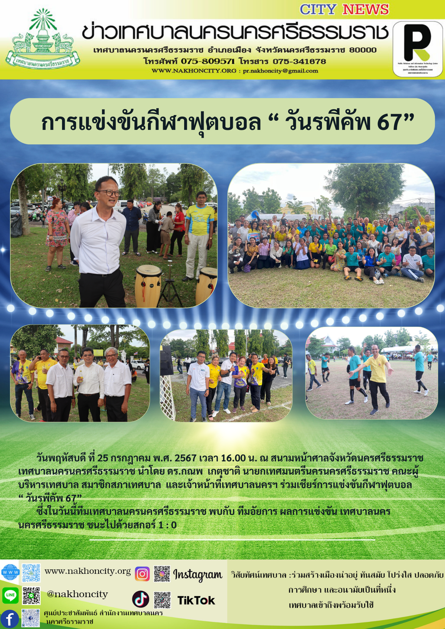 | ดร.กณพ เกตุชาติ นายกเทศมนตรีนครนครศรีธรรมราช คณะผู้บริหารเทศบาล สมาชิกสภาเทศบาล และเจ้าหน้าที่เทศบาลนครฯ ร่วมเชียร์การแข่งขันกีฬาฟุตบอล “ วันรพีคัพ 67” |