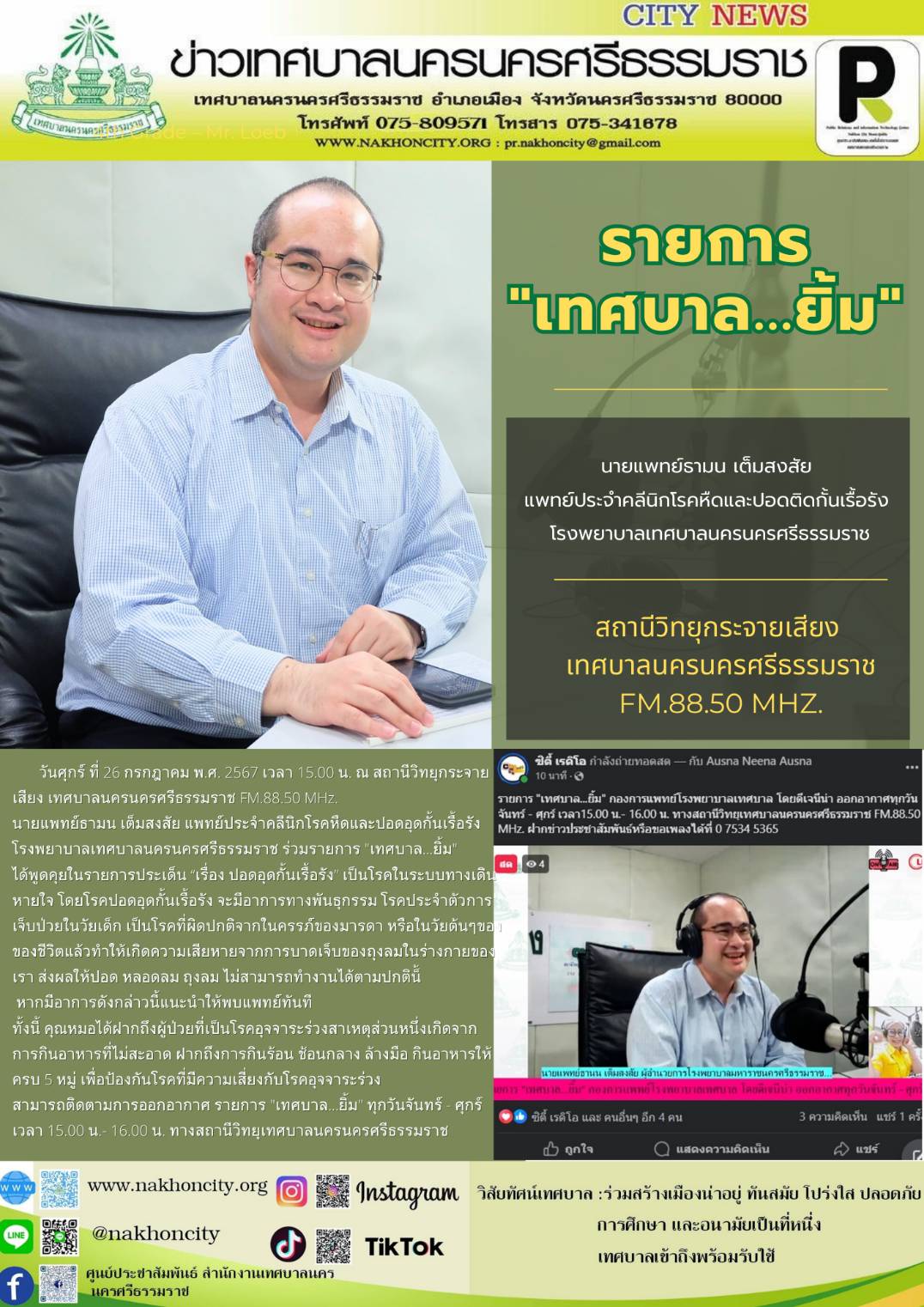 | นายแพทย์ธามน เต็มสงสัย แพทย์ประจำคลีนิกโรคหืดและปอดอุดกั้นเรื้อรัง โรงพยาบาลเทศบาลนครนครศรีธรรมราช ร่วมรายการ "เทศบาล...ยิ้ม" |