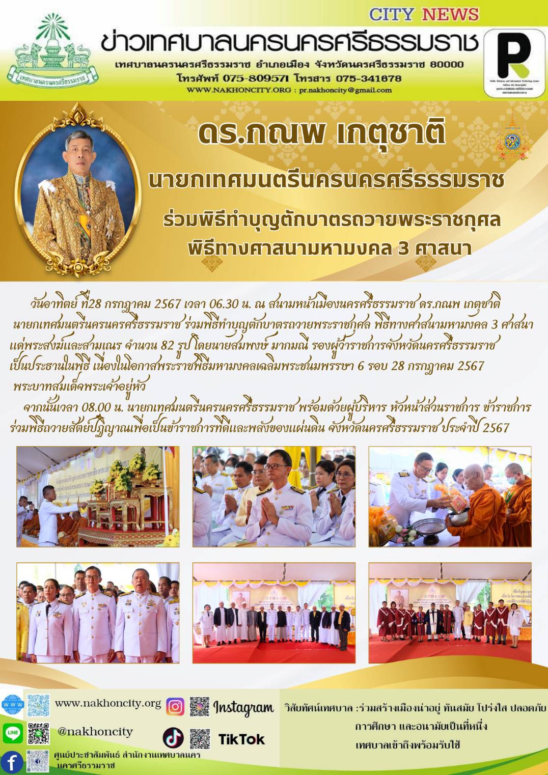 | ดร.กณพ เกตุชาติ นายกเทศมนตรีนครนครศรีธรรมราช ร่วมพิธีทำบุญตักบาตรถวายพระราชกุศล พิธีทางศาสนามหามงคล 3 ศาสนา เนื่องในโอกาสพระราชพิธีมหามงคลเฉลิมพระชนมพรรษา 6 รอบ 28 กรกฎาคม 2567 พระบาทสมเด็จพระเจ้าอยู่หัว |