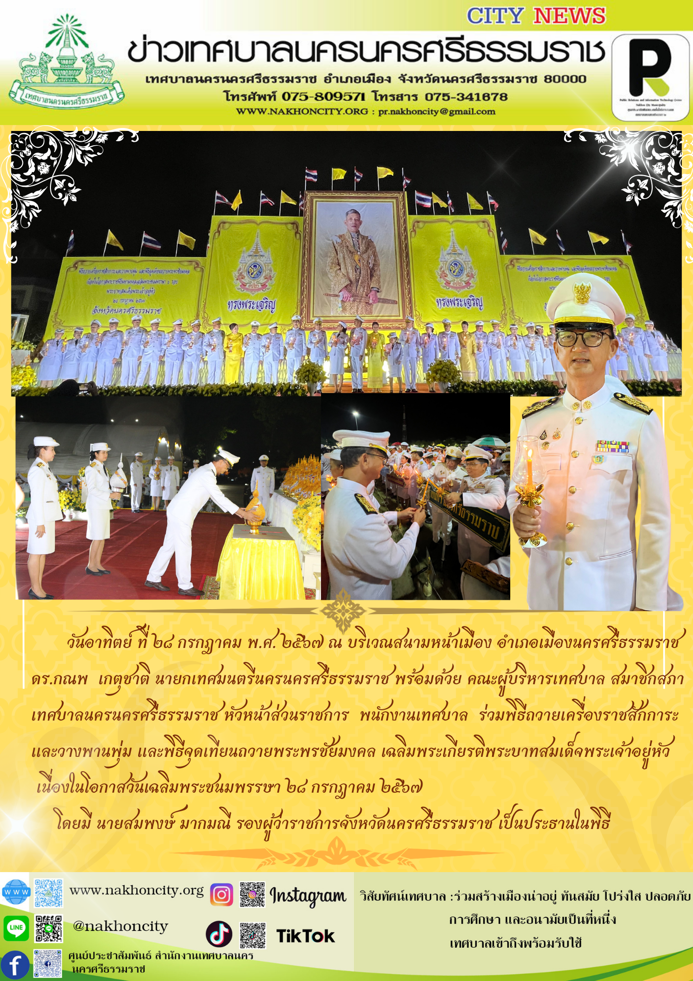 | วันอาทิตย์ ที่ 28 กรกฎาคม พ.ศ. 2567 ณ บริเวณสนามหน้าเมือง อำเภอเมืองนครศรีธรรมราช ดร.กณพ เกตุชาติ นายกเทศมนตรีนครนครศรีธรรมราช พร้อมด้วย คณะผู้บริหารเทศบาล สมาชิกสภาเทศบาลหัวหน้าส่วนราชการ พนักงานเทศบาล ร่วมพิธีถวายเครื่องราชสักการะและวางพานพุ่ม และพิธีจุดเทียนถวายพระพรชัยมงคล เฉลิมพระเกียรติพระบาทสมเด็จพระเจ้าอยู่หัว เนื่องในโอกาสวันเฉลิมพระชนมพรรษา วันที่ 28 กรกฎาคม 2567 โดยมี นายสมพงษ์ มากมณี รองผู้ว่าราชการจังหวัดนครศรีธรรมราช เป็นประธานในพิธี |