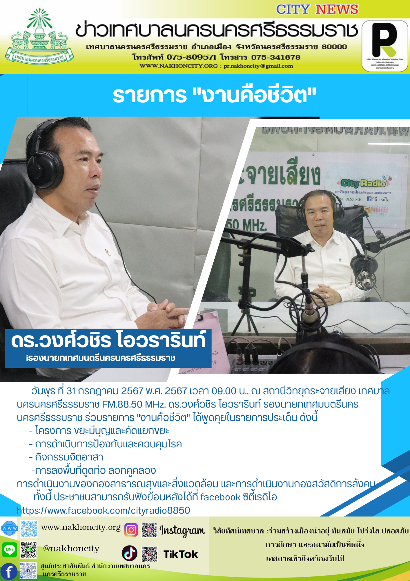 | วันพุธ ที่ 31 กรกฎาคม 2567 พ.ศ. 2567 เวลา 09.00 น. ณ สถานีวิทยุกระจายเสียง เทศบาลนครนครศรีธรรมราช FM.88.50 MHz. ดร.วงศ์วชิร โอวรารินท์ รองนายกเทศมนตรีนครนครศรีธรรมราช ร่วมรายการ "งานคือชีวิต" ได้พูดคุยในรายการประเด็น ดังนี้ - โครงการ ขยะมีบุญและคัดแยกขยะ - การดำเนินการป้องกันและควบคุมโรค -กิจกรรมจิตอาสา -การลงพื้นที่ดูดท่อ ลอกคูคลอง การดำเนินงานของกองสาธารณสุขและสิ่งแวดล้อม และการดำเนินงานกองสวัสดิการสังคม ทั้งนี้ ประชาชนสามารถรับฟังย้อนหลังได้ที่ facebook ซิตี้เรดิโอ https://www.facebook.com/cityradio8850