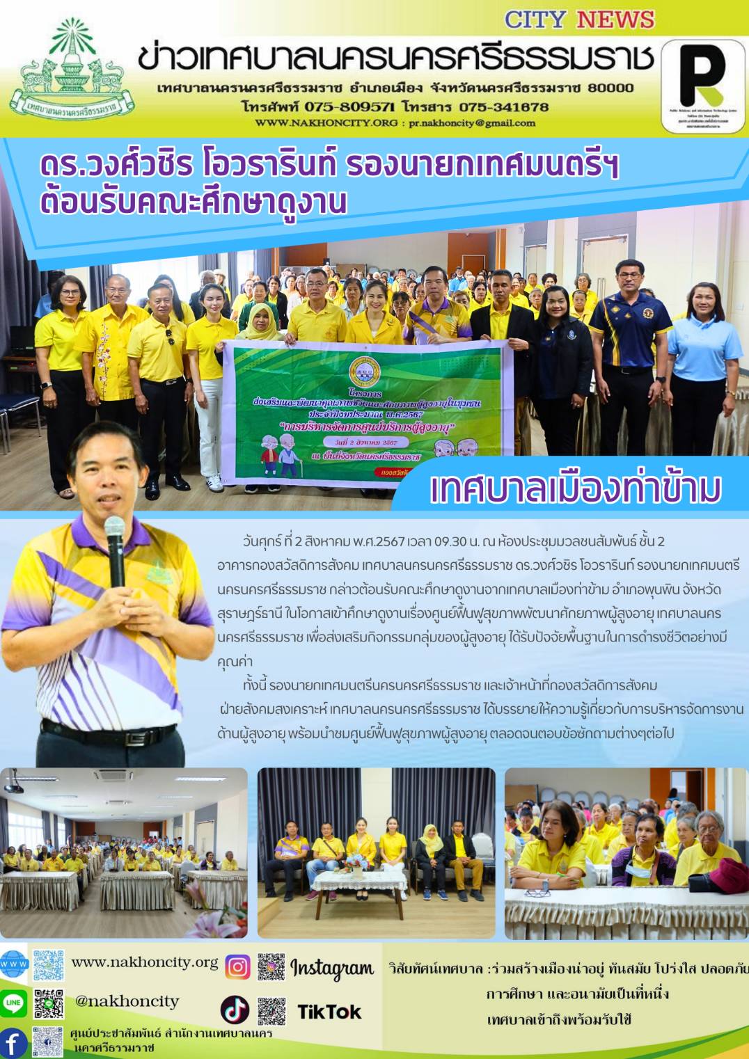 | วันศุกร์ ที่ 2 สิงหาคม พ.ศ.2567 เวลา 09.30 น. ณ ห้องประชุมมวลชนสัมพันธ์ ชั้น 2 อาคารกองสวัสดิการสังคม เทศบาลนครนครศรีธรรมราช ดร.วงศ์วชิร โอวรารินท์ รองนายกเทศมนตรีนครนครศรีธรรมราช กล่าวต้อนรับคณะศึกษาดูงานจากเทศบาลเมืองท่าข้าม อำเภอพุนพิน จังหวัดสุราษฎร์ธานี ในโอกาสเข้าศึกษาดูงานเรื่องศูนย์ฟื้นฟูสุขภาพพัฒนาศักยภาพผู้สูงอายุ เทศบาลนครนครศรีธรรมราช เพื่อส่งเสริมกิจกรรมกลุ่มของผู้สูงอายุ ได้รับปัจจัยพื้นฐานในการดำรงชีวิตอย่างมีคุณค่า ทั้งนี้ รองนายกเทศมนตรีนครนครศรีธรรมราช และเจ้าหน้าที่กองสวัสดิการสังคม ฝ่ายสังคมสงเคราะห์ เทศบาลนครนครศรีธรรมราช ได้บรรยายให้ความรู้เกี่ยวกับการบริหารจัดการงานด้านผู้สูงอายุ พร้อมนำชมศูนย์ฟื้นฟูสุขภาพผู้สูงอายุ ตลอดจนตอบข้อซักถามต่างๆต่อไป ............... ภาพ//ข่าว//จันทร์จิรา ตรวจทาน//ฐิตินันท์ |