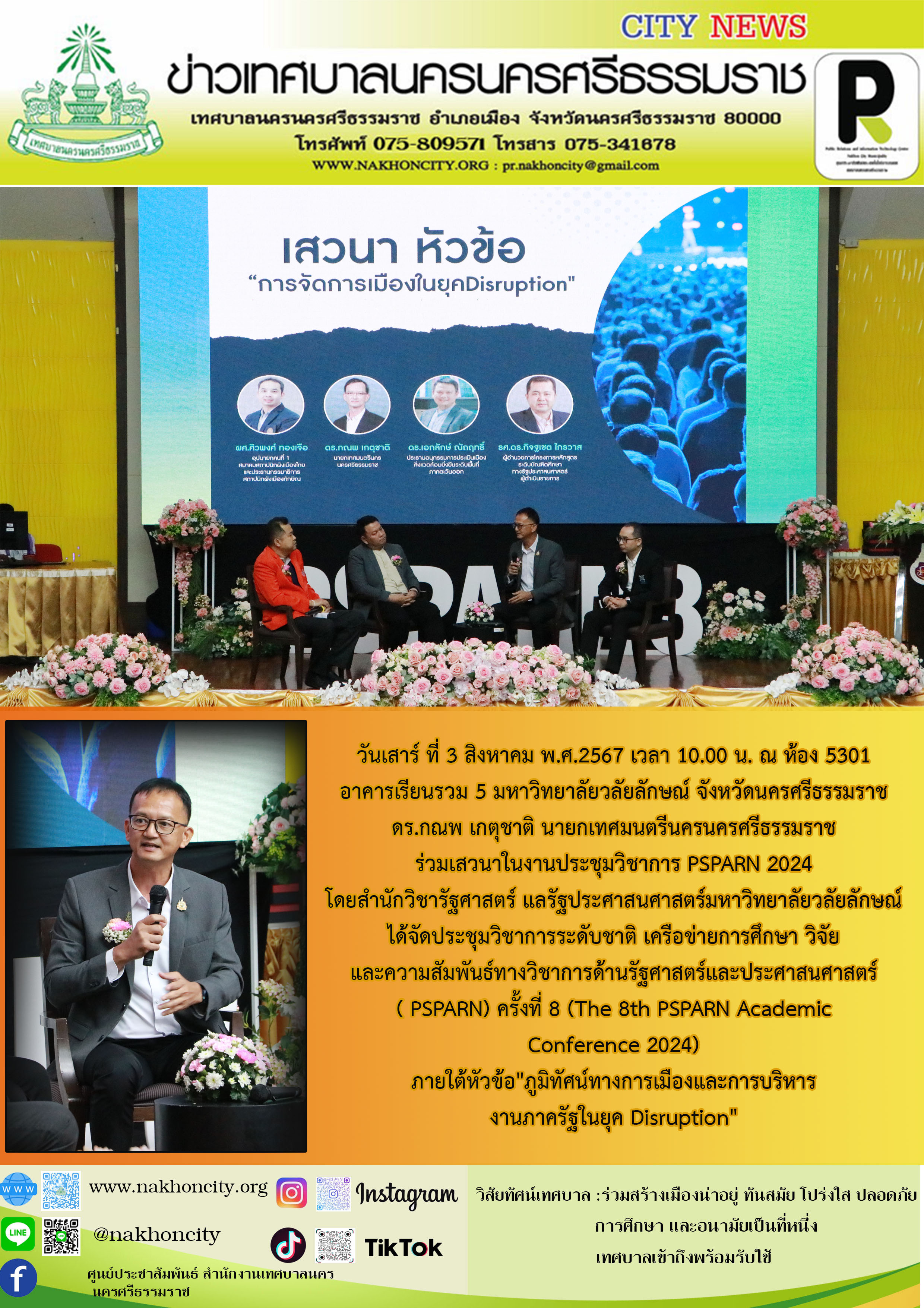 | นายกเทศมนตรีนครนครศรีธรรมราชร่วมเสวนาในงานประชุมวิชาการ PSPARN 2024 โดยสำนักวิชารัฐศาสตร์ แลรัฐประศาสนศาสตร์มหาวิทยาลัยวลัยลักษณ์ |