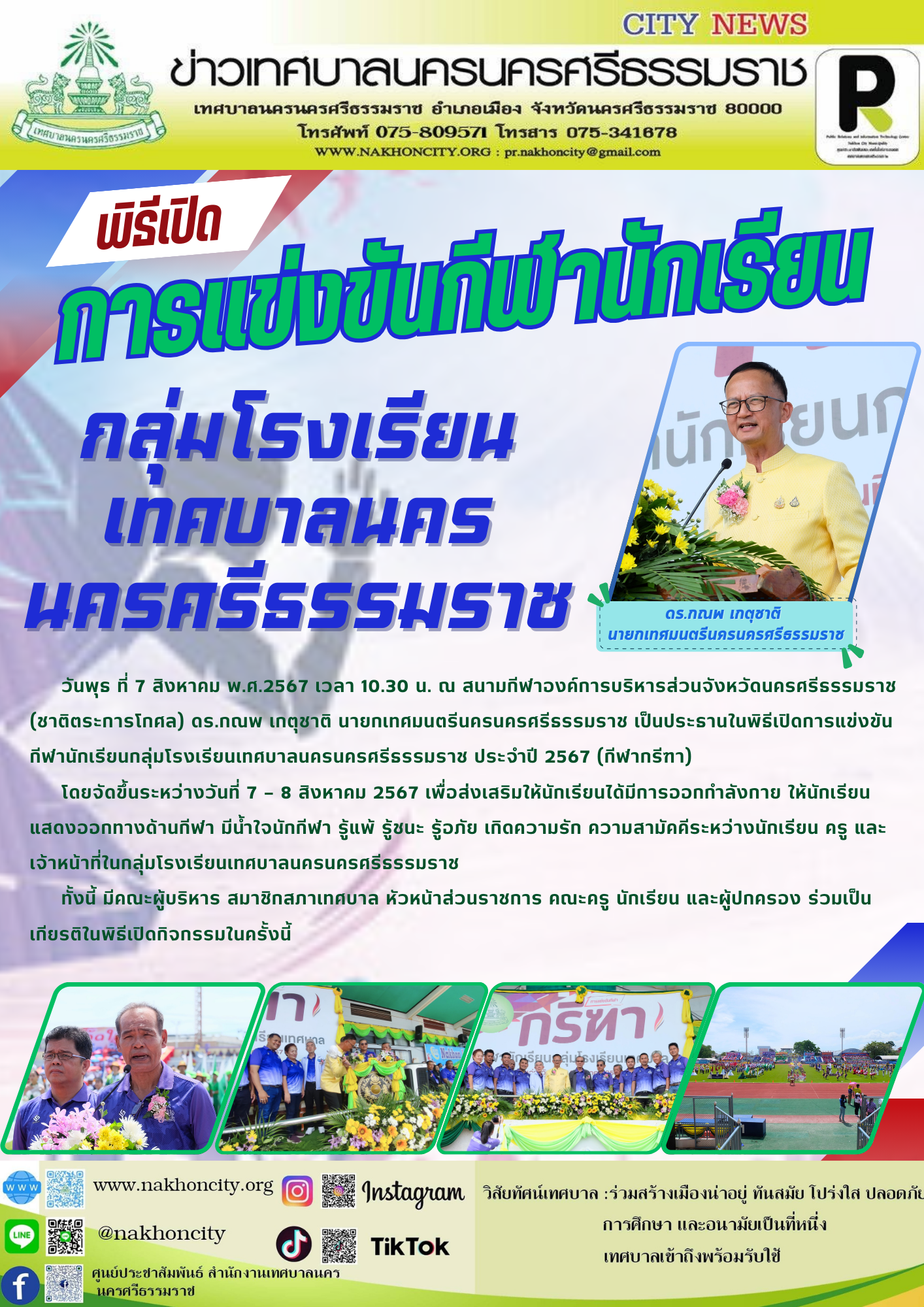 | ดร.กณพ เกตุชาติ นายกเทศมนตรีนครนครศรีธรรมราช เป็นประธานในพิธีเปิดการแข่งขันกีฬานักเรียนกลุ่มโรงเรียนเทศบาลนครนครศรีธรรมราช ประจำปี 2567 (กีฬากรีฑา) |