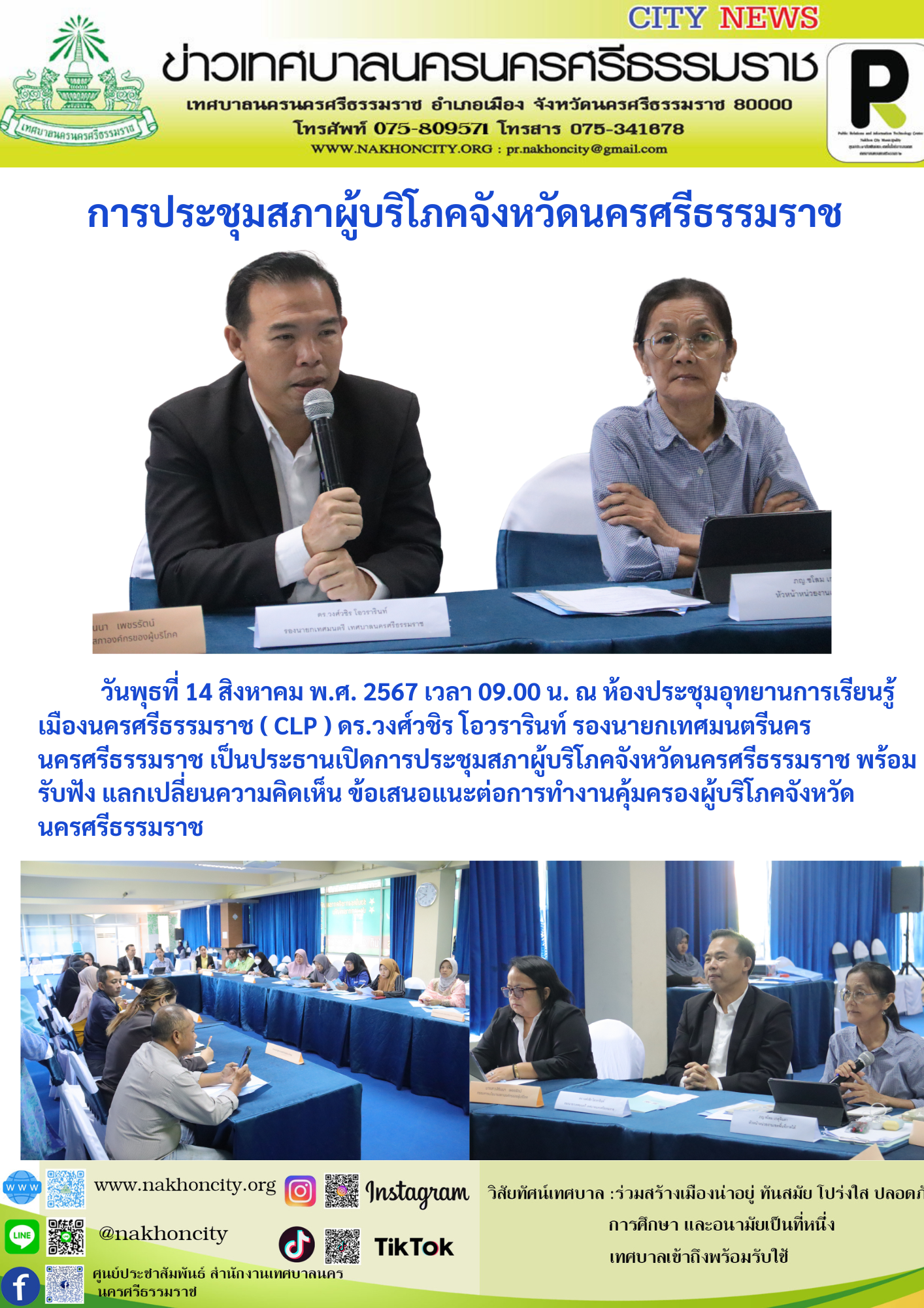 | วันพุธที่ 14 สิงหาคม พ.ศ. 2567 เวลา 09.00 น. ณ ห้องประชุมอุทยานการเรียนรู้เมืองนครศรีธรรมราช ( CLP ) ดร.วงศ์วชิร โอวรารินท์ รองนายกเทศมนตรีนครนครศรีธรรมราช เป็นประธานเปิดการประชุมสภาผู้บริโภคจังหวัดนครศรีธรรมราช พร้อมรับฟัง แลกเปลี่ยนความคิดเห็น ข้อเสนอแนะต่อการทำงานคุ้มครองผู้บริโภคจังหวัดนครศรีธรรมราช |