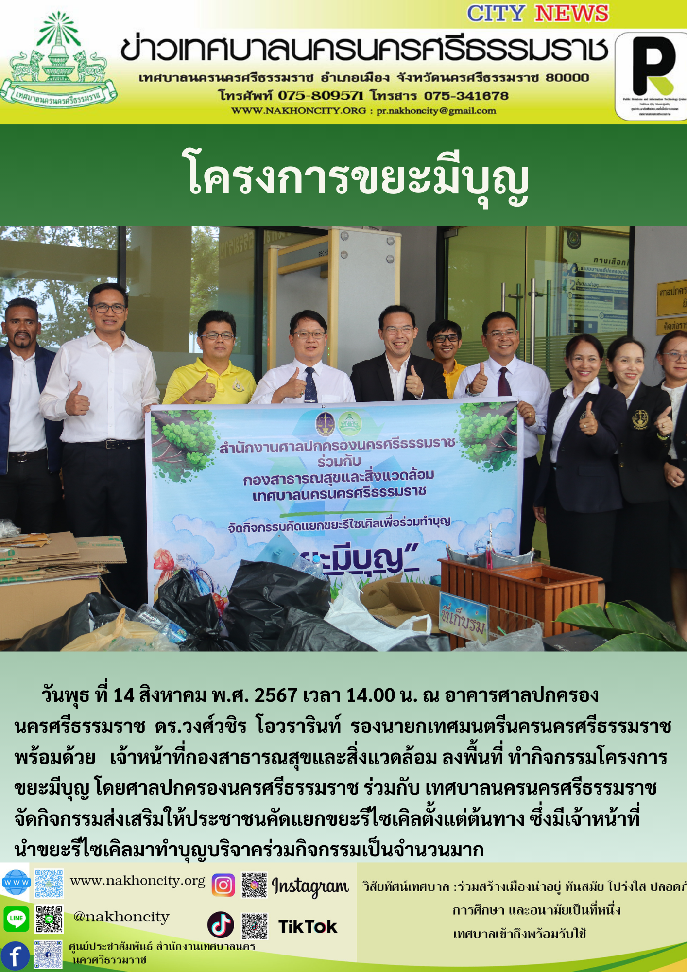 | วันพุธ ที่ 14 สิงหาคม พ.ศ. 2567 เวลา 10.00 น. ดร.วงศ์วชิร โอวรารินท์ รองนายกเทศมนตรีนครนครศรีธรรมราช พร้อมด้วยเจ้าหน้าที่กองสาธารณสุขและสิ่งแวดล้อม ลงพื้นที่ ทำกิจกรรมโครงการขยะมีบุญ โดยศาลปกครองนครศรีธรรมราช ร่วมกับ เทศบาลนครนครศรีธรรมราช จัดกิจกรรมส่งเสริมให้ประชาชนคัดแยกขยะรีไซเคิลตั้งแต่ต้นทาง ซึ่งมีเจ้าหน้าที่ นำขยะรีไซเคิลมาทำบุญบริจาคร่วมกิจกรรมเป็นจำนวนมาก |