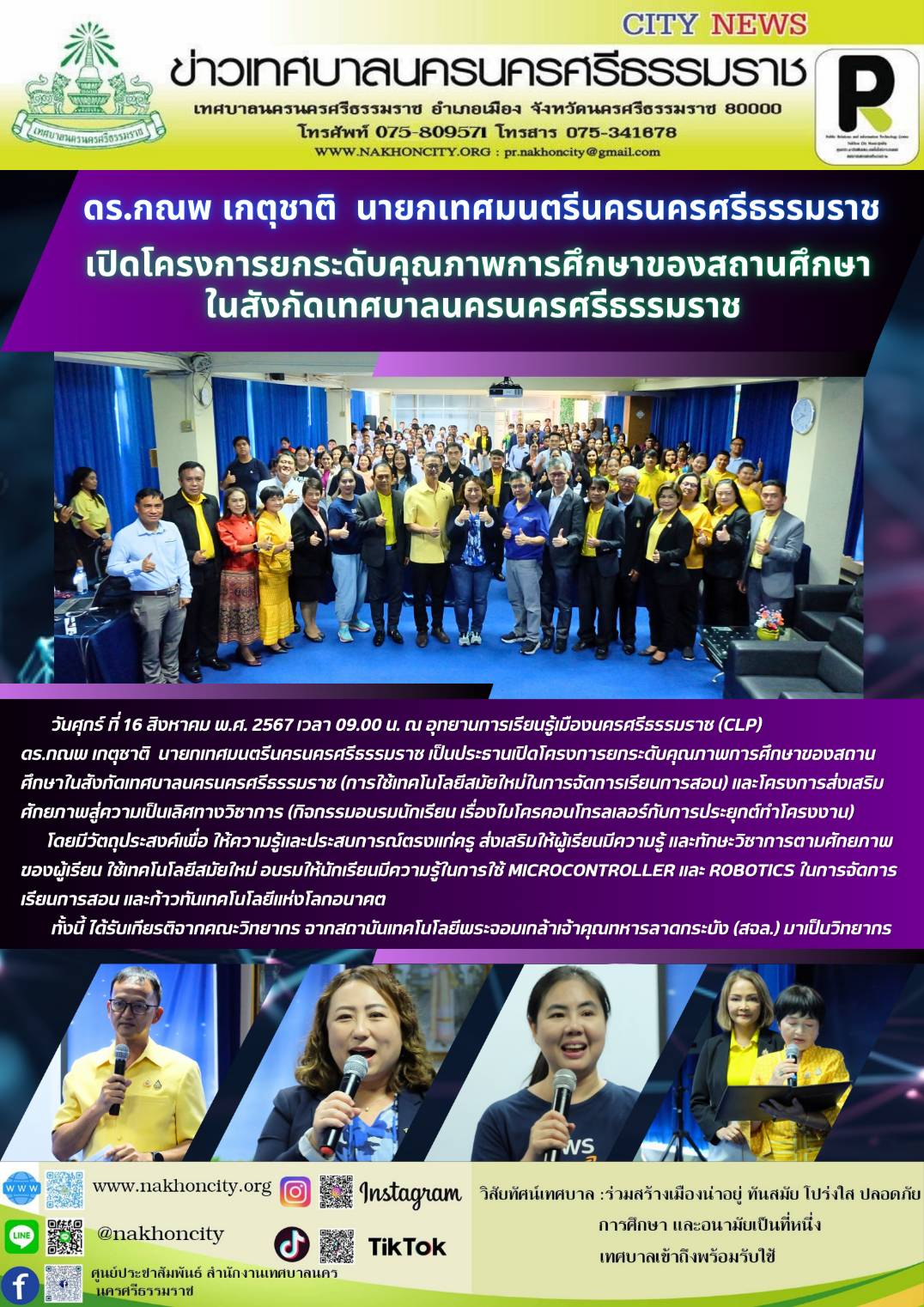 | ดร.กณพ เกตุชาติ นายกเทศมนตรีนครนครศรีธรรมราช เป็นประธานเปิดโครงการยกระดับคุณภาพการศึกษาของสถานศึกษาในสังกัดเทศบาลนครนครศรีธรรมราช |