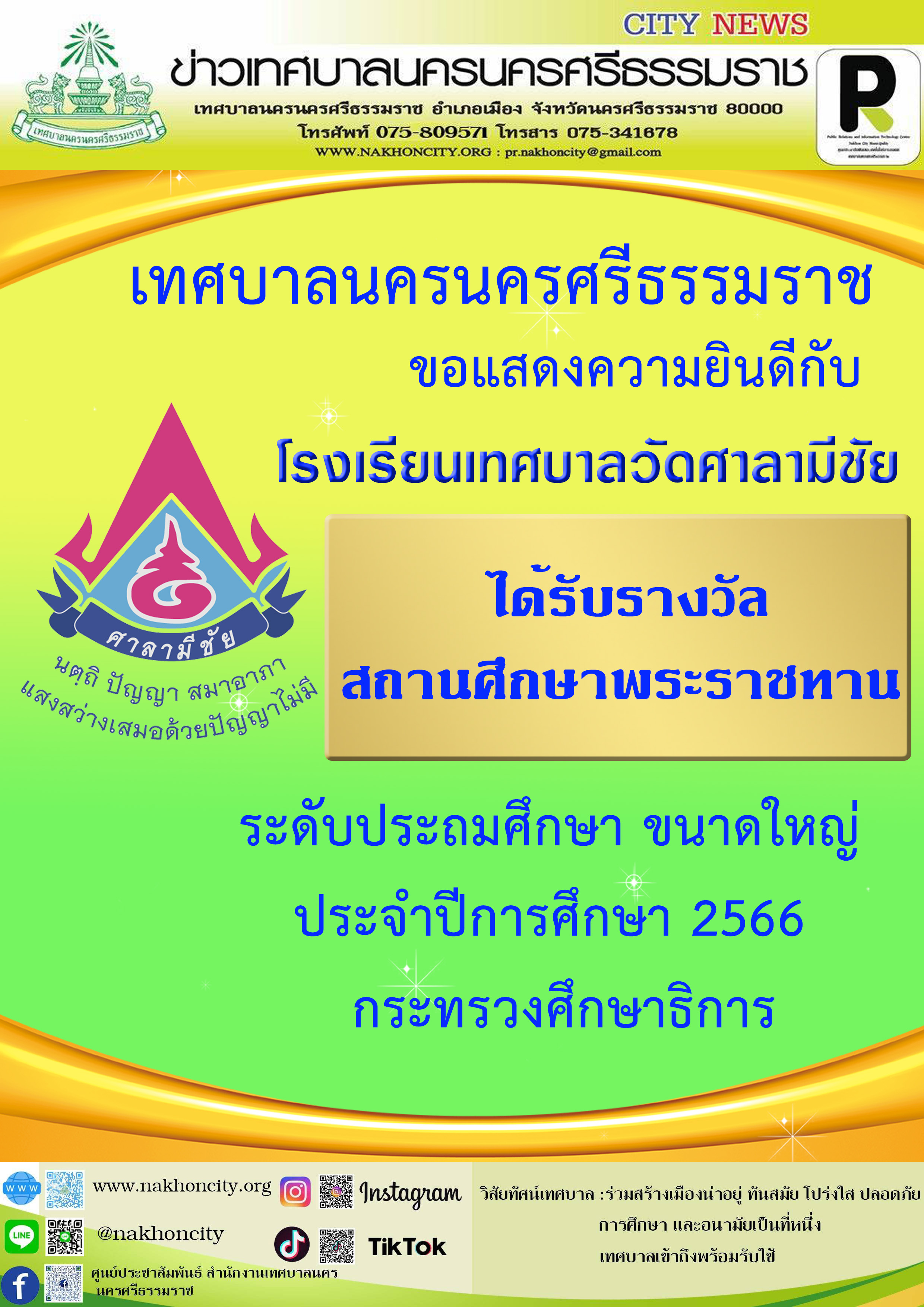 | เทศบาลนครนครศรีธรรมราช ขอแสดงความยินดีกับโรงเรียนเทศบาลวัดศาลามีชัย ได้รับรางวัล สถานศึกษาพระราชทาน ระดับประถมศึกษา ประจำปีการศึกษา 2566 กลุ่มจังหวัดที่ 3 ขนาดใหญ่ ตามประกาศกระทรวงศึกษาธิการ เรื่อง รายชื่อนักเรียน นักศึกษา และสถานศึกษาที่ได้รับรางวัลพระราชทาน ประจำปีการศึกษา 2566 ลงวันที่ 6 สิงหาคม 2567 |