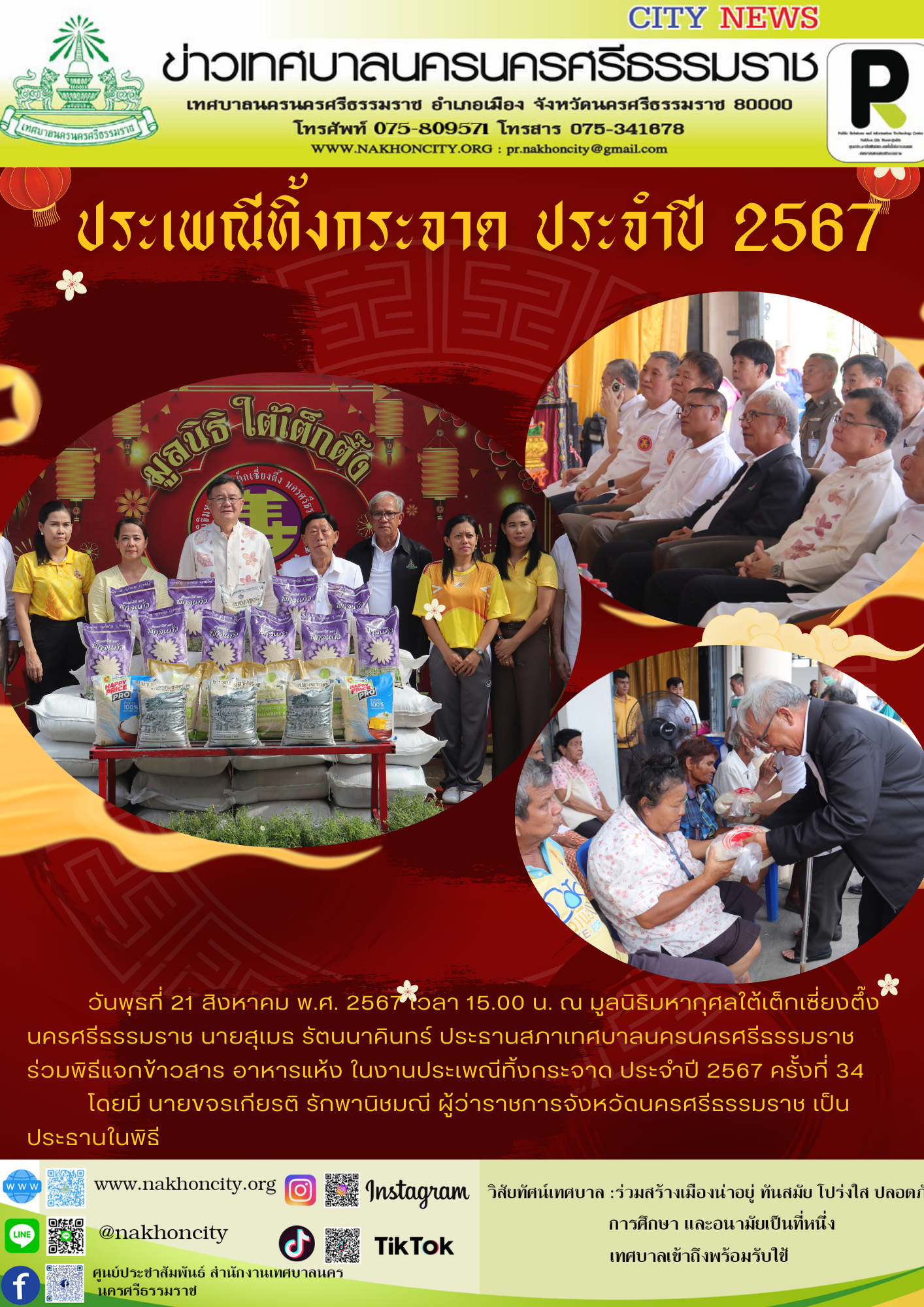 | วันพุธที่ 21 สิงหาคม พ.ศ. 2567 เวลา 15.00 น. ณ มูลนิธิมหากุศลใต้เต็กเซี่ยงตึ๊งนครศรีธรรมราช นายสุเมธ รัตนนาคินทร์ ประธานสภาเทศบาลนครนครศรีธรรมราช ร่วมพิธีแจกข้าวสาร อาหารแห้ง ในงานประเพณีทิ้งกระจาด ประจำปี 2567 ครั้งที่ 34 โดยมี นายขจรเกียรติ รักพานิชมณี ผู้ว่าราชการจังหวัดนครศรีธรรมราช เป็นประธานในพิธี |