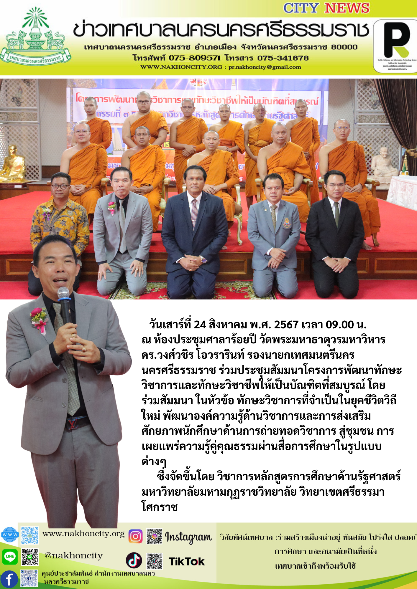 | วันเสาร์ที่ 24 สิงหาคม พ.ศ. 2567 เวลา 09.00 น. ณ ห้องประชุมศาลาร้อยปี วัดพระมหาธาตุวรมหาวิหาร ดร.วงศ์วชิร โอวรารินท์ รองนายกเทศมนตรีนครนครศรีธรรมราช ร่วมประชุมสัมมนาโครงการพัฒนาทักษะวิชาการและทักษะวิชาชีพให้เป็นบัณฑิตที่สมบูรณ์ โดยร่วมสัมมนา ในหัวข้อ ทักษะวิชาการที่จำเป็นในยุคชีวิตวิถีใหม่ พัฒนาองค์ความรู้ด้านวิชาการและการส่งเสริมศักยภาพนักศึกษาด้านการถ่ายทอดวิชาการ สู่ชุมชน การเผยแพร่ความรู้คู่คุณธรรมผ่านสื่อการศึกษาในรูปแบบต่างๆ ซึ่งจัดขึ้นโดย วิชาการหลักสูตรการศึกษาด้านรัฐศาสตร์ มหาวิทยาลัยมหามกุฏราชวิทยาลัย วิทยาเขตศรีธรรมาโศกราช |