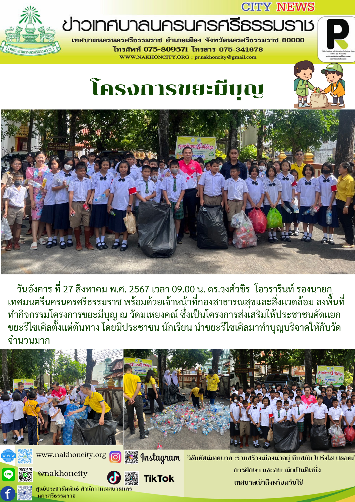 | วันอังคาร ที่ 27 สิงหาคม พ.ศ. 2567 เวลา 09.00 น. ดร.วงศ์วชิร โอวรารินท์ รองนายกเทศมนตรีนครนครศรีธรรมราช พร้อมด้วยเจ้าหน้าที่กองสาธารณสุขและสิ่งแวดล้อม ลงพื้นที่ ทำกิจกรรมโครงการขยะมีบุญ ณ วัดมเหยงคณ์ ซึ่งเป็นโครงการส่งเสริมให้ประชาชนคัดแยกขยะรีไซเคิลตั้งแต่ต้นทาง โดยมีประชาชน นักเรียน นำขยะรีไซเคิลมาทำบุญบริจาคให้กับวัดจำนวนมาก |