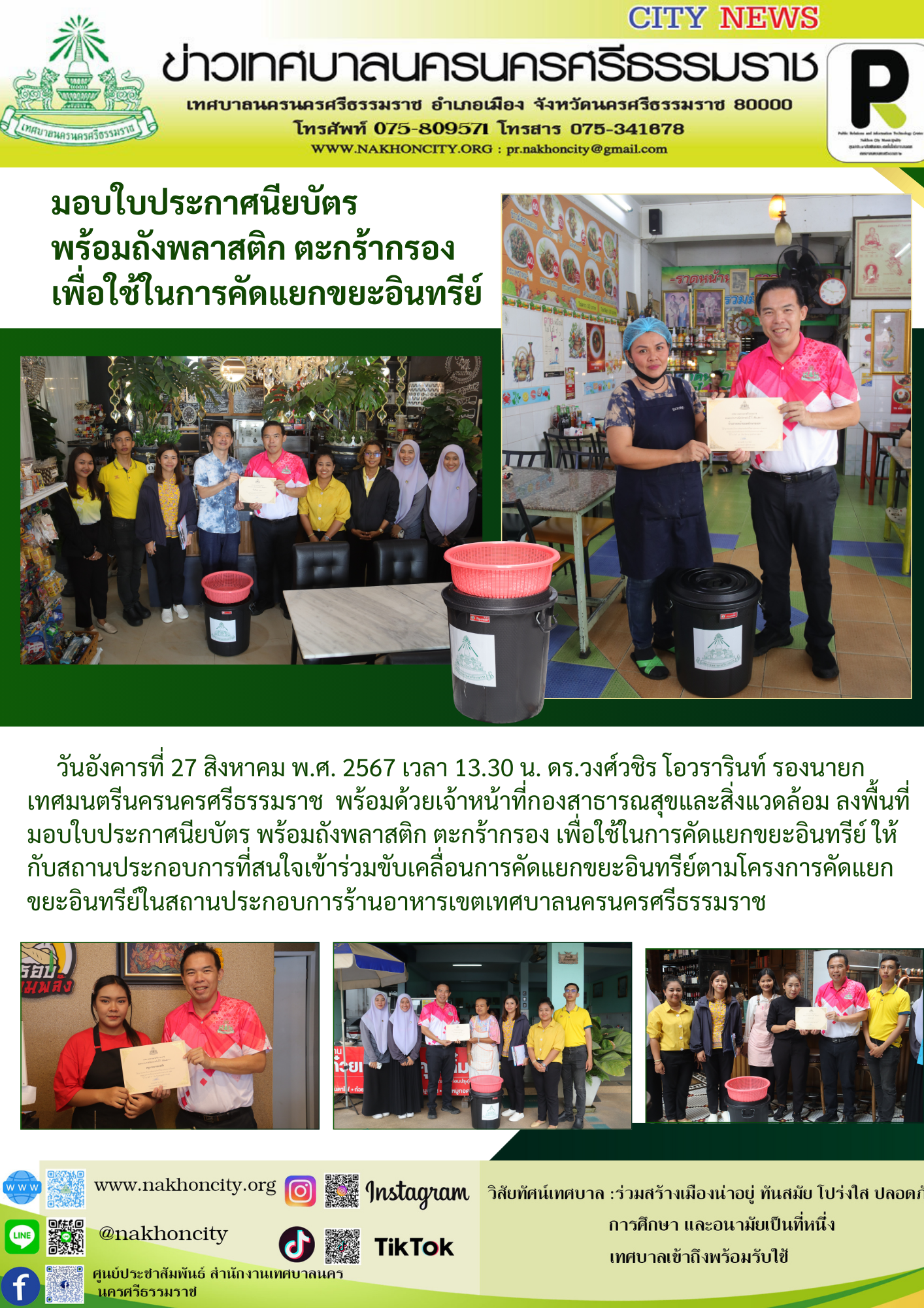 | ดร.วงศ์วชิร โอวรารินท์ รองนายกเทศมนตรีนครนครศรีธรรมราช พร้อมด้วยเจ้าหน้าที่กองสาธารณสุขและสิ่งแวดล้อม ลงพื้นที่ มอบใบประกาศนียบัตร พร้อมถังพลาสติก ตะกร้ากรอง เพื่อใช้ในการคัดแยกขยะอินทรีย์ ให้กับสถานประกอบการที่สนใจเข้าร่วมขับเคลื่อนการคัดแยกขยะอินทรีย์ตามโครงการคัดแยกขยะอินทรีย์ในสถานประกอบการร้านอาหารเขตเทศบาลนครนครศรีธรรมราช |