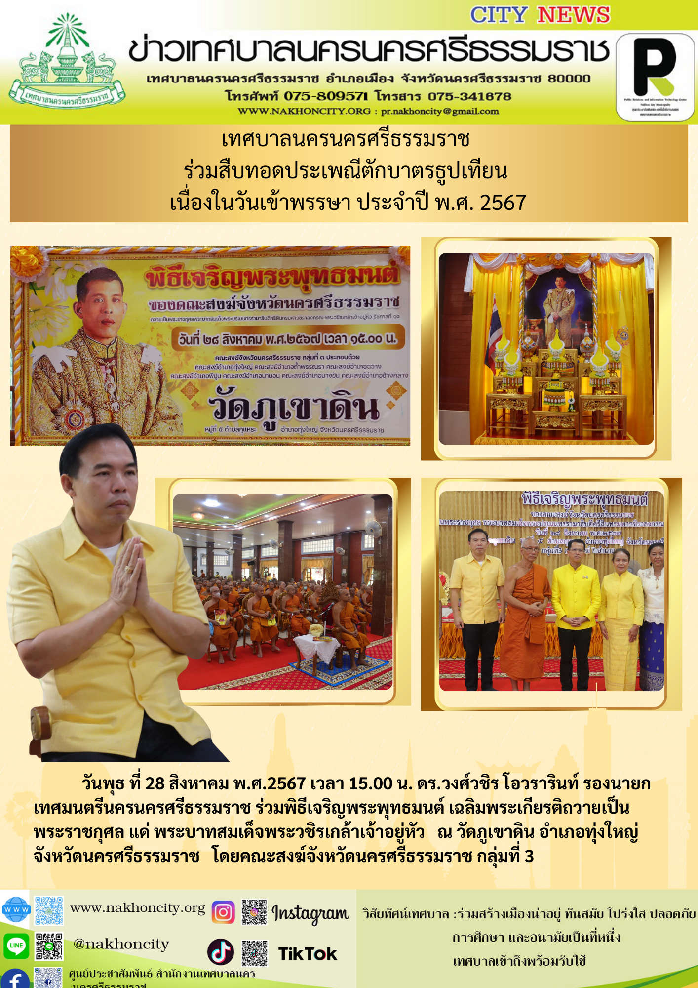 | ร.วงศ์วชิร โอวรารินท์ รองนายกเทศมนตรีนครนครศรีธรรมราช ร่วมพิธีเจริญพระพุทธมนต์ เฉลิมพระเกียรติถวายเป็นพระราชกุศล แด่ พระบาทสมเด็จพระวชิรเกล้าเจ้าอยู่หัว ณ วัดภูเขาดิน อำเภอทุ่งใหญ่ จังหวัดนครศรีธรรมราช |