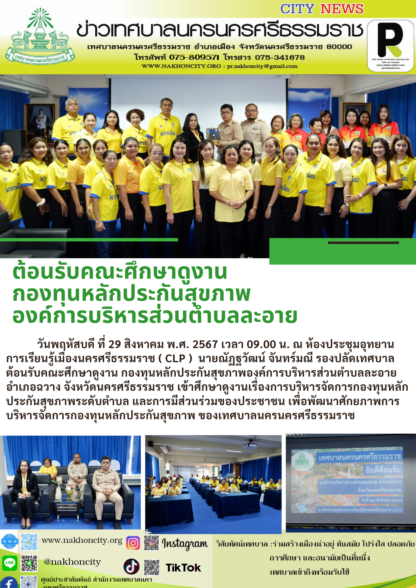 | วันพฤหัสบดี ที่ 29 สิงหาคม พ.ศ. 2567 เวลา 09.00 น. ณ ห้องประชุมอุทยานการเรียนรู้เมืองนครศรีธรรมราช ( CLP ) นายณัฏฐวัฒน์ จันทร์มณี รองปลัดเทศบาล ต้อนรับคณะศึกษาดูงาน กองทุนหลักประกันสุขภาพองค์การบริหารส่วนตำบลละอาย อำเภอฉวาง จังหวัดนครศรีธรรมราช เข้าศึกษาดูงานเรื่องการบริหารจัดการกองทุนหลักประกันสุขภาพระดับตำบล และการมีส่วนร่วมของประชาชน เพื่อพัฒนาศักยภาพการบริหารจัดการกองทุนหลักประกันสุขภาพ ของเทศบาลนครนครศรีธรรมราช |