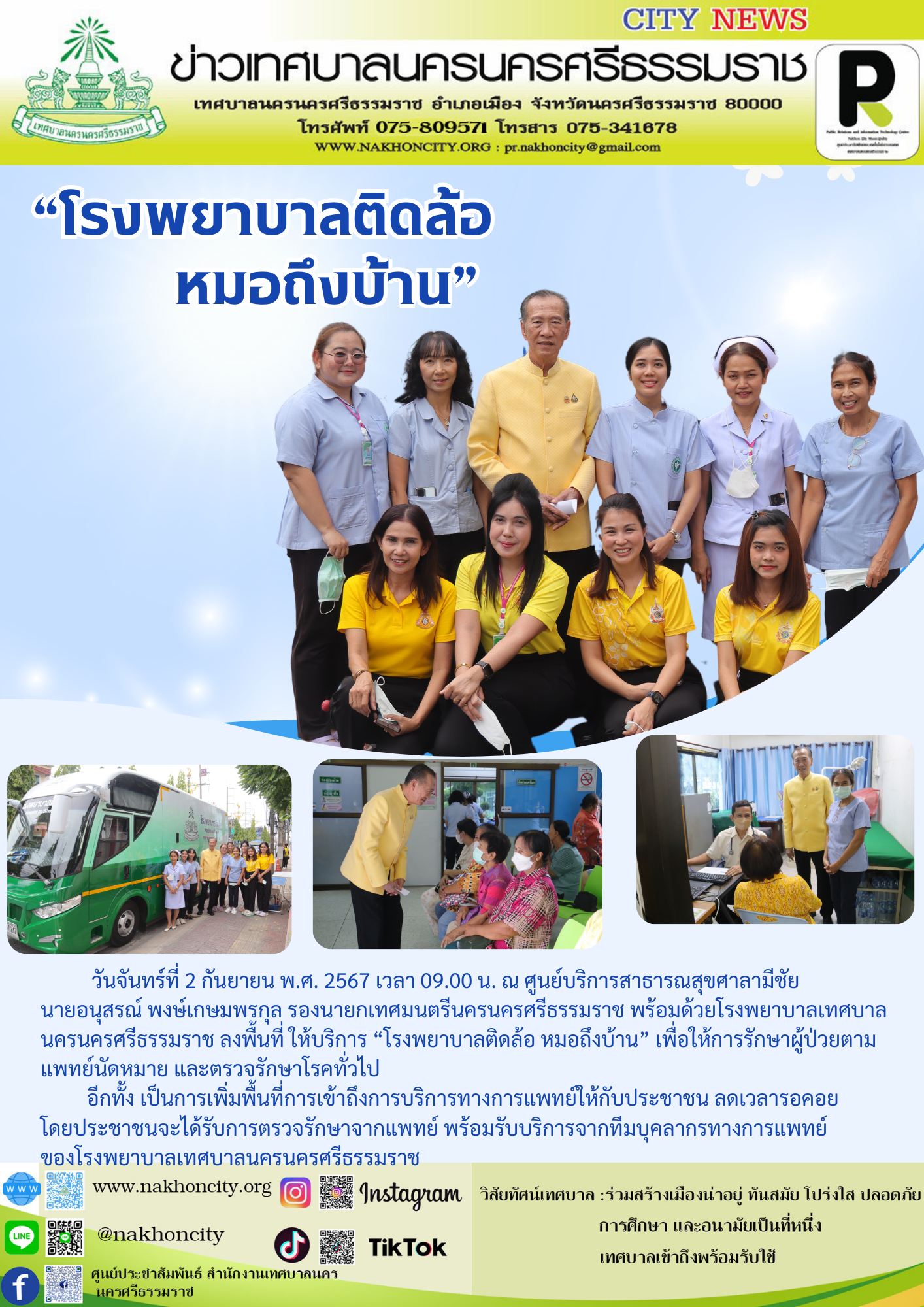 | นายอนุสรณ์ พงษ์เกษมพรกุล รองนายกเทศมนตรีนครนครศรีธรรมราช พร้อมด้วย เจ้าหน้าที่โรงพยาบาลเทศบาลนครนครศรีธรรมราช ลงพื้นที่ ให้บริการ “โรงพยาบาลติดล้อ หมอถึงบ้าน” |