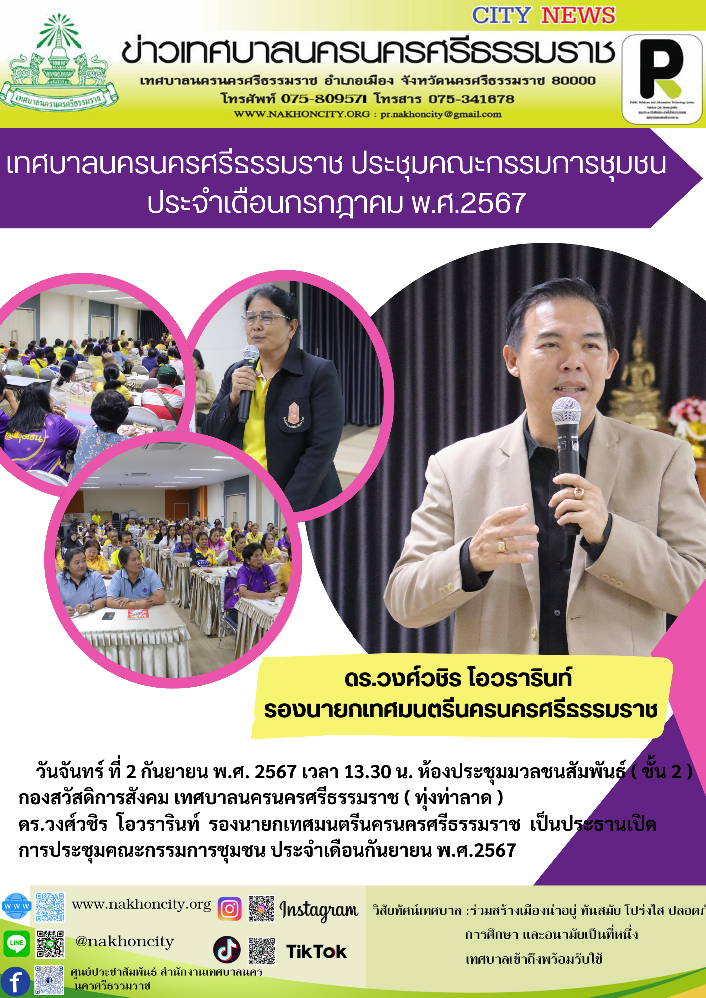 | ดร.วงศ์วชิร โอวรารินท์ รองนายกเทศมนตรีนครนครศรีธรรมราช เป็นประธานเปิด การประชุมคณะกรรมการชุมชน ประจำเดือนกันยายน พ.ศ.2567 |