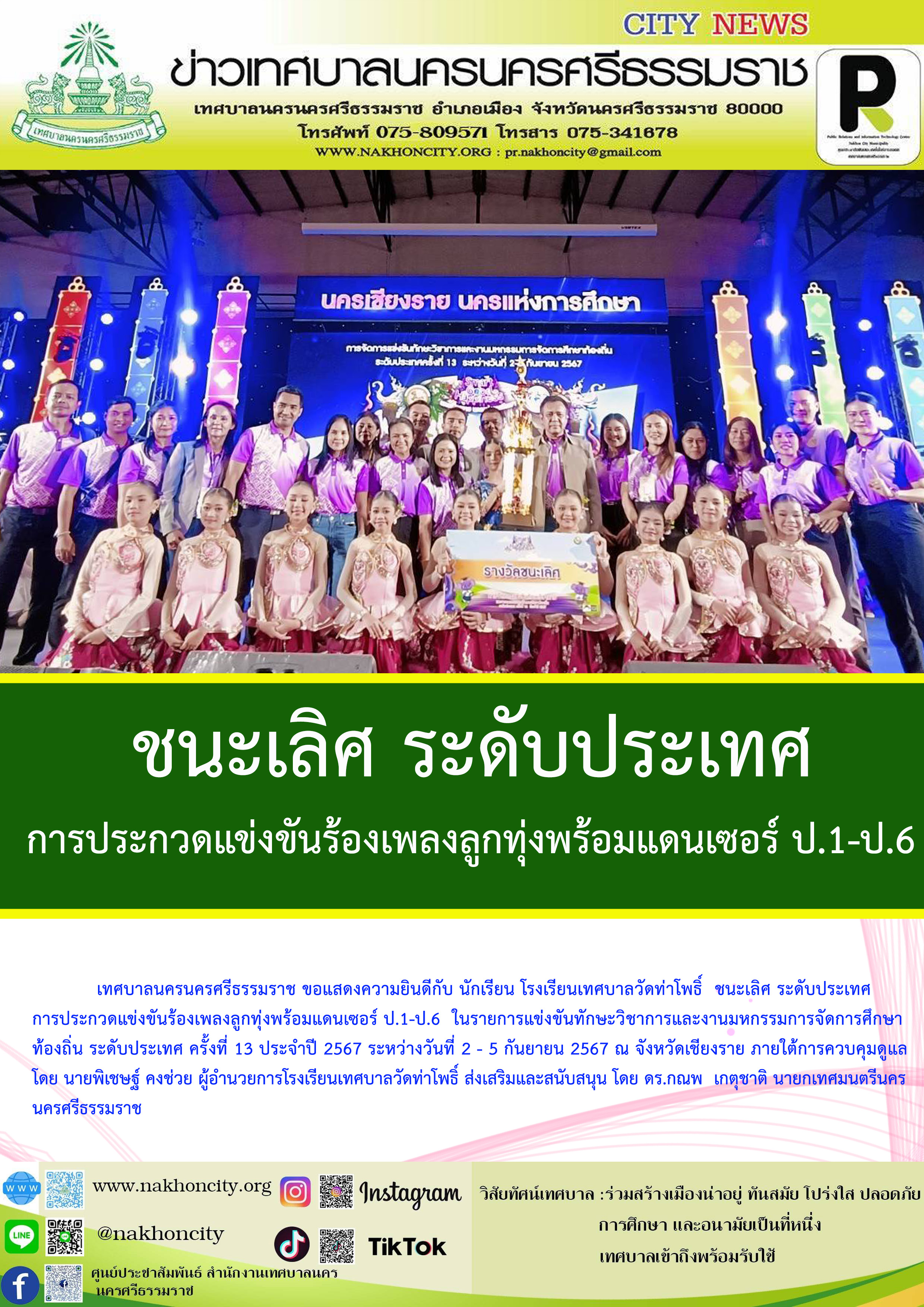 | เทศบาลนครนครศรีธรรมราช ขอแสดงความยินดีกับ นักเรียน โรงเรียนเทศบาลวัดท่าโพธิ์ ชนะเลิศ ระดับประเทศ การประกวดแข่งขันร้องเพลงลูกทุ่งพร้อมแดนเซอร์ ป.1-ป.6 ในรายการแข่งขันทักษะวิชาการและงานมหกรรมการจัดการศึกษาท้องถิ่น ระดับประเทศ ครั้งที่ 13 ประจำปี 2567 ระหว่างวันที่ 2 - 5 กันยายน 2567 ณ จังหวัดเชียงราย ภายใต้การควบคุมดูแล โดย นายพิเชษฐ์ คงช่วย ผู้อำนวยการโรงเรียนเทศบาลวัดท่าโพธิ์ ส่งเสริมและสนับสนุน โดย ดร.กณพ เกตุชาติ นายกเทศมนตรีนครนครศรีธรรมราช |