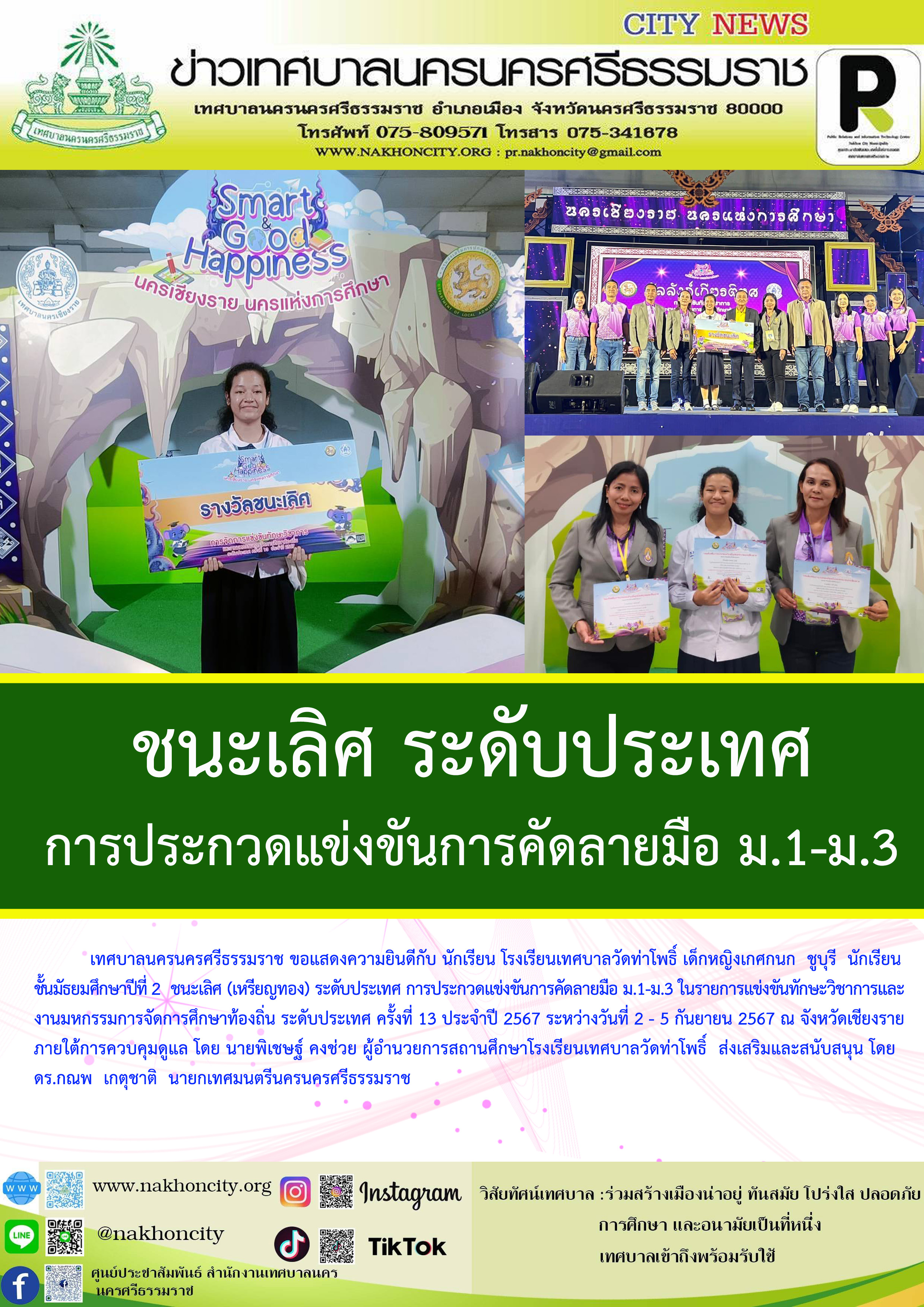 | เทศบาลนครนครศรีธรรมราช ขอแสดงความยินดีกับ นักเรียน โรงเรียนเทศบาลวัดท่าโพธิ์ เด็กหญิงเกศกนก ชูบุรี นักเรียนชั้นมัธยมศึกษาปีที่ 2 ชนะเลิศ ระดับประเทศ การประกวดแข่งขันการคัดลายมือ ม.1-ม.3 ในรายการแข่งขันทักษะวิชาการและงานมหกรรมการจัดการศึกษาท้องถิ่น ระดับประเทศ ครั้งที่ 13 ประจำปี 2567 ระหว่างวันที่ 2 - 5 กันยายน 2567 ณ จังหวัดเชียงราย ภายใต้การควบคุมดูแล โดย นายพิเชษฐ์ คงช่วย ผู้อำนวยการโรงเรียนเทศบาลวัดท่าโพธิ์ ส่งเสริมและสนับสนุน โดย ดร.กณพ เกตุชาติ นายกเทศมนตรีนครนครศรีธรรมราช |