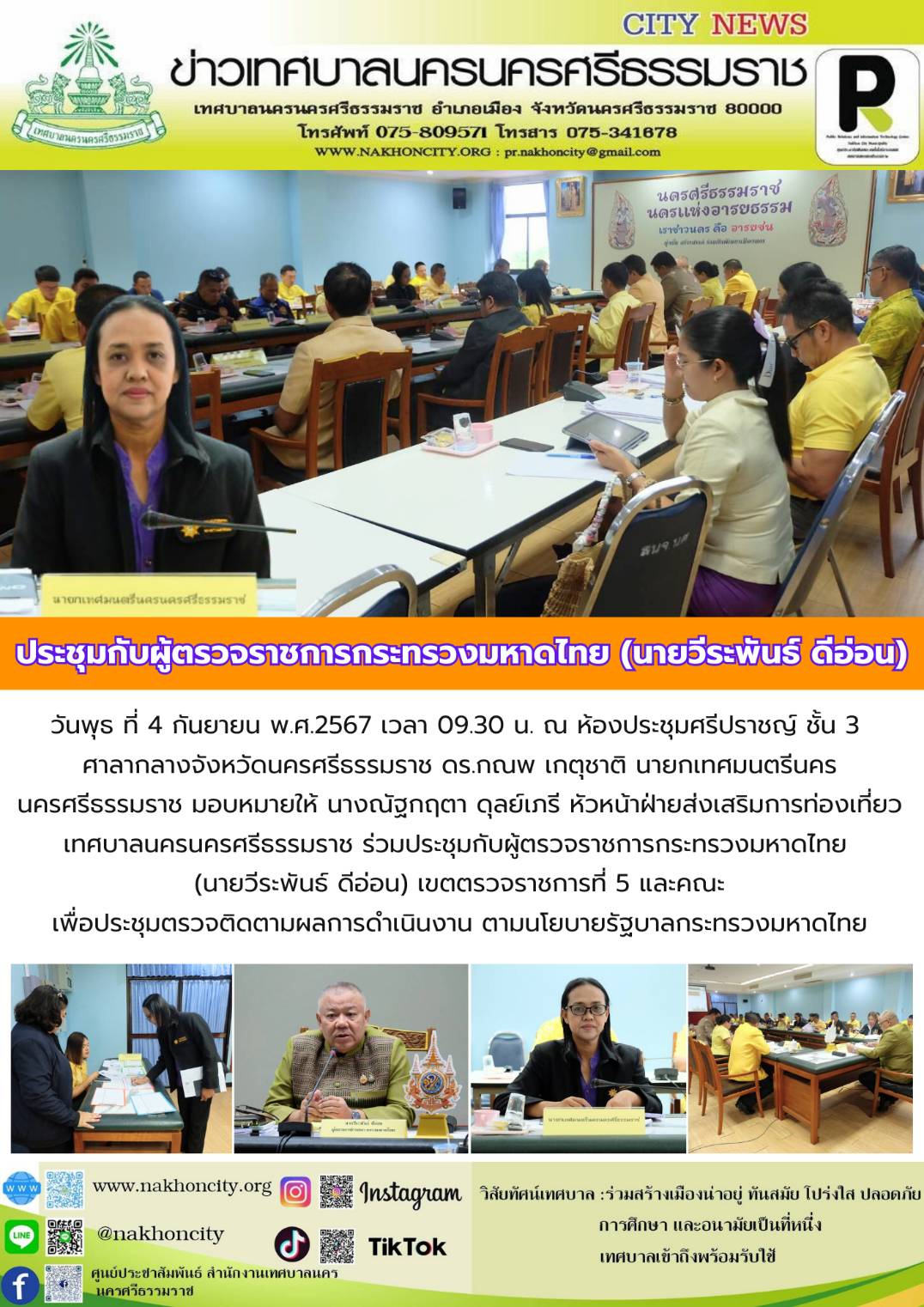 | นางณัฐกฤตา ดุลย์เภรี หัวหน้าฝ่ายส่งเสริมการท่องเที่ยว เทศบาลนครนครศรีธรรมราช ร่วมประชุมกับผู้ตรวจราชการกระทรวงมหาดไทย (นายวีระพันธ์ ดีอ่อน) |