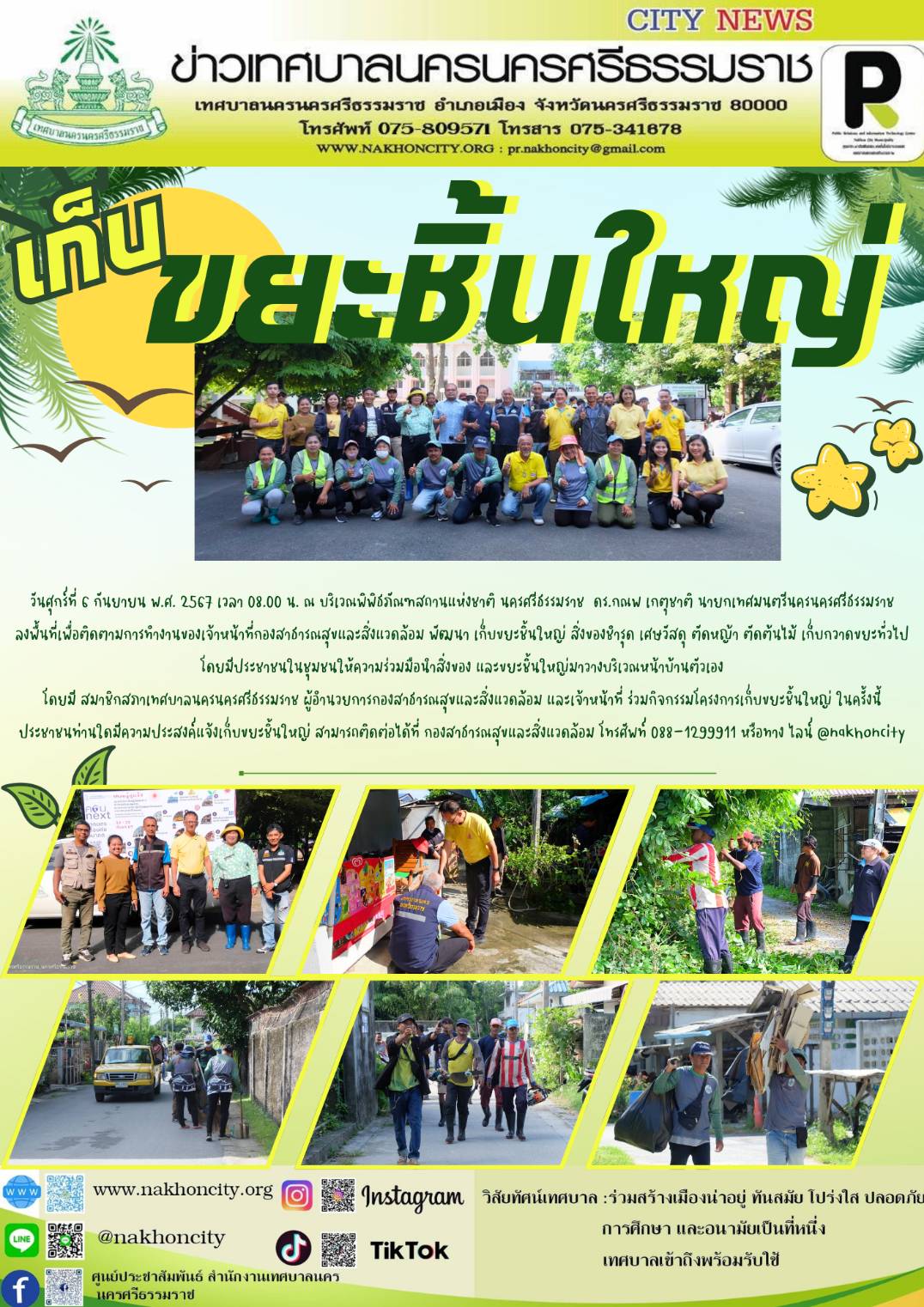 | วันศุกร์ที่ 6 กันยายน พ.ศ. 2567 เวลา 08.00 น. ณ บริเวณพิพิธภัณฑสถานแห่งชาติ นครศรีธรรมราช ดร.กณพ เกตุชาติ นายกเทศมนตรีนครนครศรีธรรมราช ลงพื้นที่เพื่อติดตามการทำงานของเจ้าหน้าที่กองสาธารณสุขและสิ่งแวดล้อม พัฒนา เก็บขยะชิ้นใหญ่ สิ่งของชำรุด เศษวัสดุ ตัดหญ้า ตัดต้นไม้ เก็บกวาดขยะทั่วไป โดยมีประชาชนในชุมชนให้ความร่วมมือนำสิ่งของ และขยะชิ้นใหญ่มาวางบริเวณหน้าบ้านตัวเอง โดยมี สมาชิกสภาเทศบาลนครนครศรีธรรมราช ผู้อำนวยการกองสาธารณสุขและสิ่งแวดล้อม และเจ้าหน้าที่ ร่วมกิจกรรมโครงการเก็บขยะชิ้นใหญ่ ในครั้งนี้ ประชาชนท่านใดมีความประสงค์แจ้งเก็บขยะชิ้นใหญ่ สามารถติดต่อได้ที่ กองสาธารณสุขและสิ่งแวดล้อม โทรศัพท์ 088-1299911 หรือทาง ไลน์ @nakhoncity |
