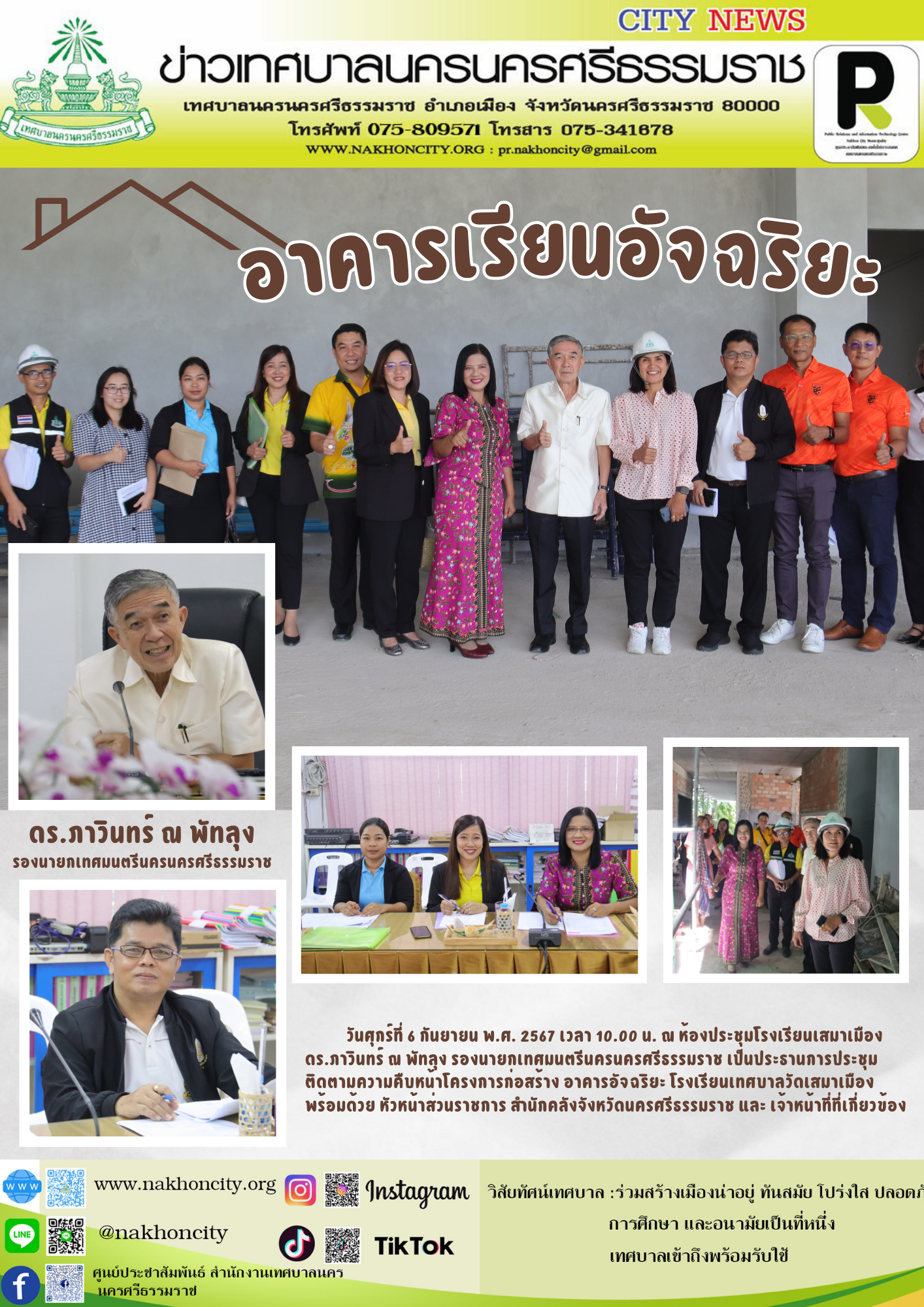| ดร.ภาวินทร์ ณ พัทลุง รองนายกเทศมนตรีนครนครศรีธรรมราช เป็นประธานการประชุมติดตามความคืบหน้าโครงการก่อสร้าง อาคารอัจฉริยะ โรงเรียนเทศบาลวัดเสมาเมือง |