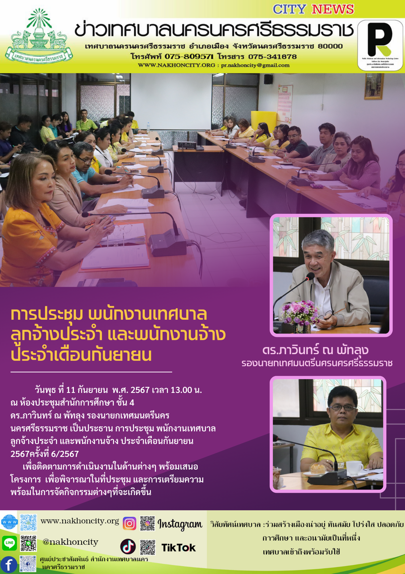 | ดร.ภาวินทร์ ณ พัทลุง รองนายกเทศมนตรีนครนครศรีธรรมราช เป็นประธานการประชุม พนักงานเทศบาลลูกจ้างประจำ และพนักงานจ้าง ประจำเดือนกันยายน 2567ครั้งที่ 6/2567 |
