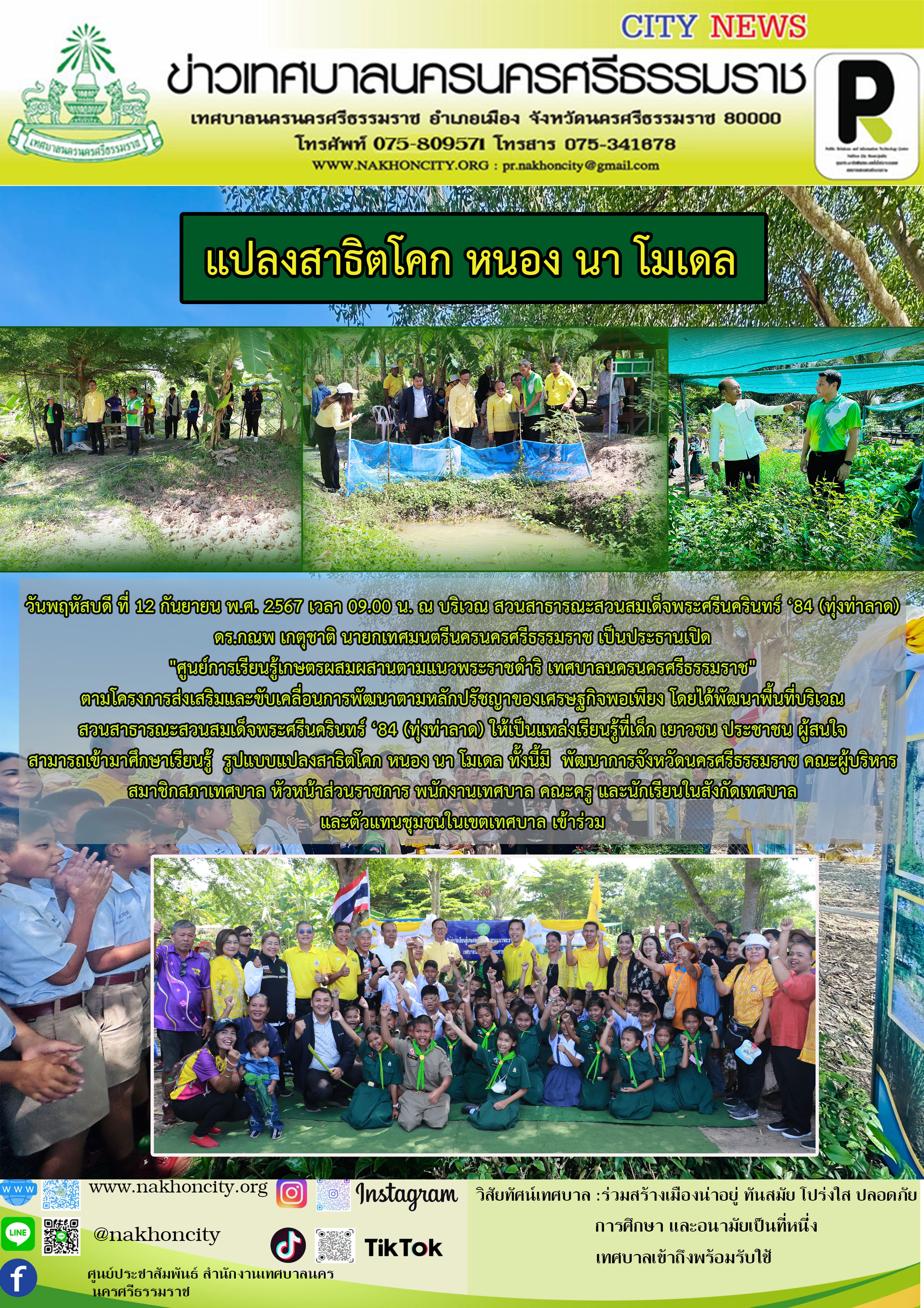 | วันพฤหัสบดี ที่ 12 กันยายน พ.ศ. 2567 เวลา 09.00 น. ณ บริเวณ สวนสาธารณะสวนสมเด็จพระศรีนครินทร์ ‘84 (ทุ่งท่าลาด) ดร.กณพ เกตุชาติ นายกเทศมนตรีนครนครศรีธรรมราช เป็นประธานเปิด "ศูนย์การเรียนรู้เกษตรผสมผสาน ตามแนวพระราชดำริ เทศบาลนครนครศรีธรรมราช" ตามโครงการส่งเสริมและขับเคลื่อนการพัฒนาตามหลักปรัชญาของเศรษฐกิจพอเพียง โดยได้พัฒนาพื้นที่บริเวณ สวนสาธารณะสวนสมเด็จพระศรีนครินทร์ ‘84 (ทุ่งท่าลาด) ให้เป็นแหล่งเรียนรู้ที่เด็ก เยาวชน ประชาชน ผู้สนใจ สามารถเข้ามาศึกษาเรียนรู้ รูปแบบแปลงสาธิตโคก หนอง นา โมเดล ทั้งนี้มี พัฒนาการจังหวัดนครศรีธรรมราช คณะผู้บริหาร สมาชิกสภาเทศบาล หัวหน้าส่วนราชการ พนักงานเทศบาล คณะครู และนักเรียนในสังกัดเทศบาล และตัวแทนชุมชนในเขตเทศบาล เข้าร่วม