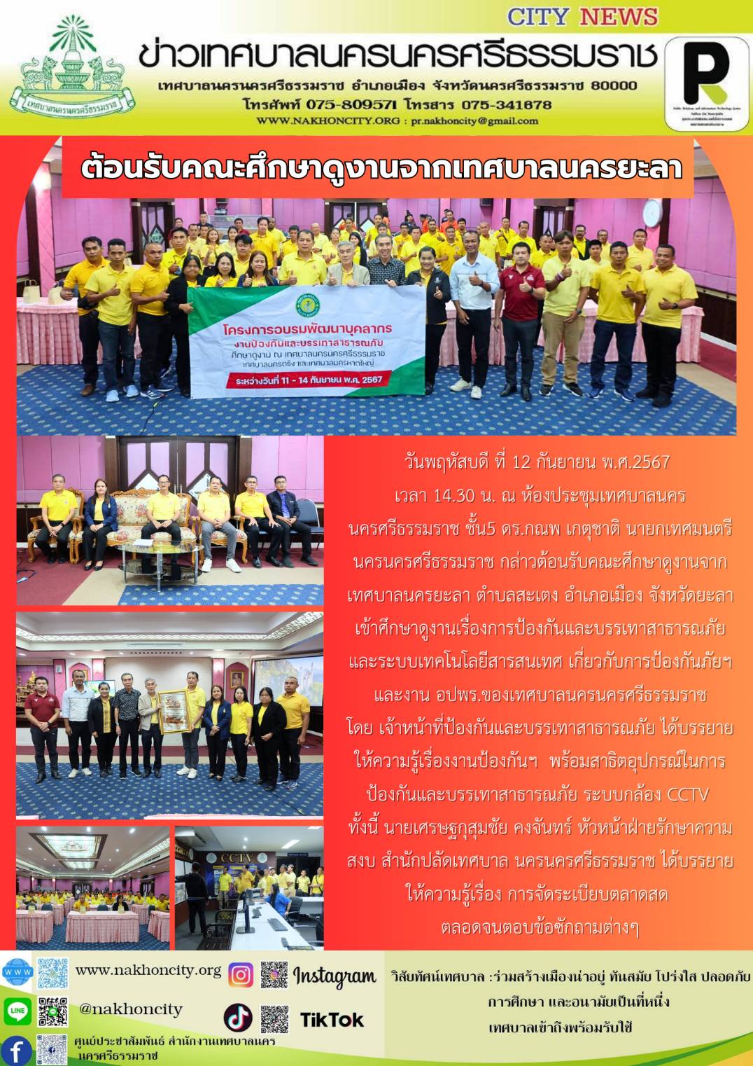 | วันพฤหัสบดี ที่ 12 กันยายน พ.ศ.2567 เวลา 14.30 น. ณ ห้องประชุมเทศบาลนครนครศรีธรรมราช ชั้น5 ดร.กณพ เกตุชาติ นายกเทศมนตรีนครนครศรีธรรมราช กล่าวต้อนรับคณะศึกษาดูงานจากเทศบาลนครยะลา ตำบลสะเตง อำเภอเมือง จังหวัดยะลา เข้าศึกษาดูงานเรื่องการป้องกันและบรรเทาสาธารณภัย และระบบเทคโนโลยีสารสนเทศ เกี่ยวกับการป้องกันภัยฯ และงาน อปพร.ของเทศบาลนครนครศรีธรรมราช โดย เจ้าหน้าที่ป้องกันและบรรเทาสาธารณภัย ได้บรรยายให้ความรู้เรื่องงานป้องกันฯ พร้อมสาธิตอุปกรณ์ในการป้องกันและบรรเทาสาธารณภัย ระบบกล้อง CCTV ทั้งนี้ นายเศรษฐกุสุมชัย คงจันทร์ หัวหน้าฝ่ายรักษาความสงบ สำนักปลัดเทศบาล นครนครศรีธรรมราช ได้บรรยายให้ความรู้เรื่อง การจัดระเบียบตลาดสด ตลอดจนตอบข้อซักถามต่างๆ ............. ภาพ//ข่าว//จันทร์จิรา |