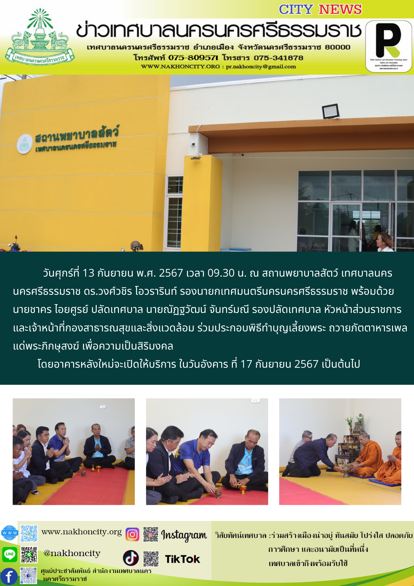 | วันศุกร์ที่ 13 กันยายน พ.ศ. 2567 เวลา 09.30 น. ณ สถานพยาบาลสัตว์ เทศบาลนครนครศรีธรรมราช ดร.วงศ์วชิร โอวรารินท์ รองนายกเทศมนตรีนครนครศรีธรรมราช พร้อมด้วย นายชาคร ไอยศูรย์ ปลัดเทศบาล นายณัฏฐวัฒน์ จันทร์มณี รองปลัดเทศบาล หัวหน้าส่วนราชการ และเจ้าหน้าที่กองสาธารณสุขและสิ่งแวดล้อม ร่วมประกอบพิธีทำบุญเลี้ยงพระ ถวายภัตตาหารเพล แด่พระภิกษุสงฆ์ เพื่อความเป็นสิริมงคล โดยอาคารหลังใหม่จะเปิดให้บริการ ในวันอังคาร ที่ 17 กันยายน 2567 เป็นต้นไป |