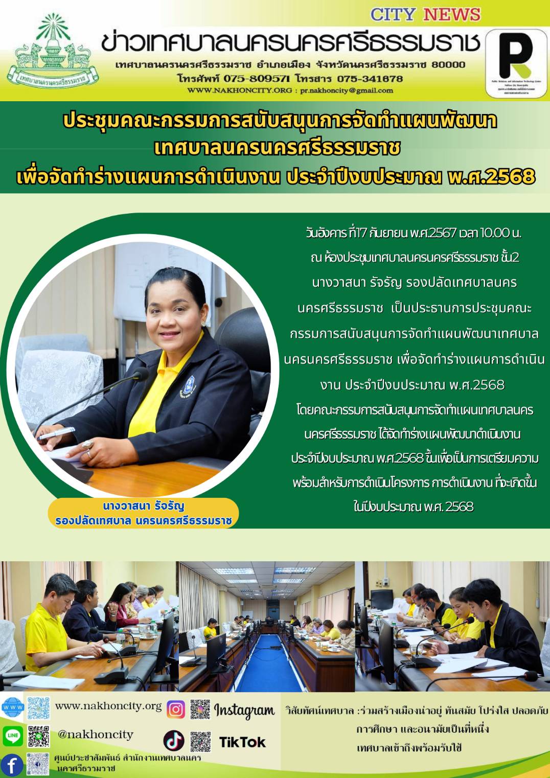| นางวาสนา รัจรัญ รองปลัดเทศบาลนครนครศรีธรรมราช เป็นประธานการประชุมคณะกรรมการสนับสนุนการจัดทำแผนพัฒนาเทศบาลนครนครศรีธรรมราช |