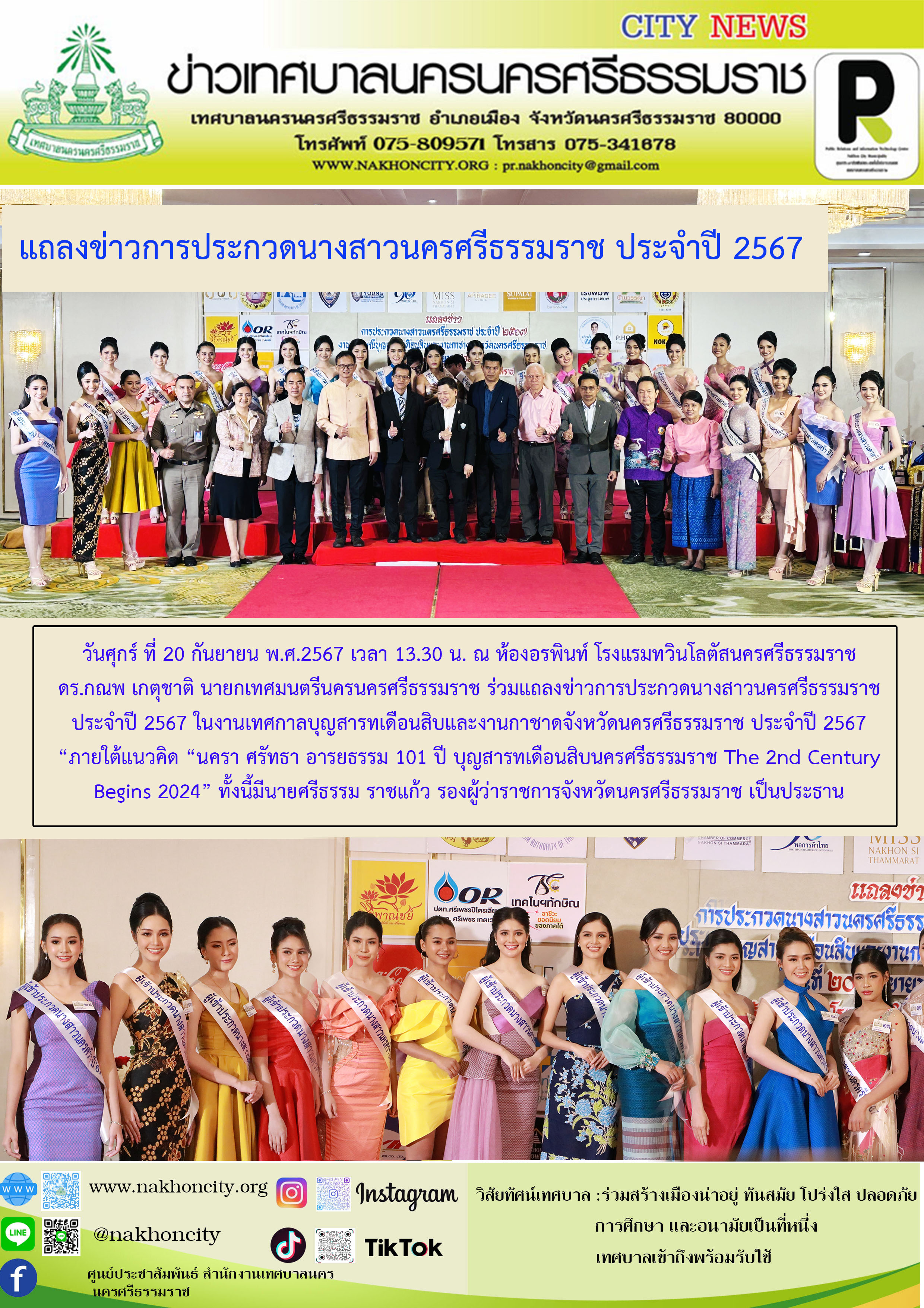 | นายกเทศมนตรีนครนครศรีธรรมราช ร่วมแถลงข่าวการประกวดนางสาวนครศรีธรรมราช ประจำปี 2567 ในงานเทศกาลบุญสารทเดือนสิบและงานกาชาดจังหวัดนครศรีธรรมราช ประจำปี 2567 “ภายใต้แนวคิด “นครา ศรัทธา อารยธรรม 101 ปี บุญสารทเดือนสิบนครศรีธรรมราช The 2nd Century Begins 2024” |