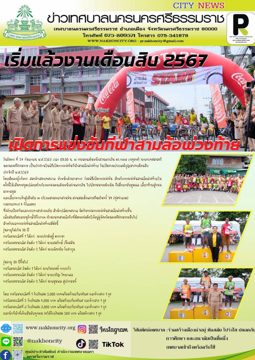 | วันอังคาร ที่ 24 กันยายน พ.ศ.2567 เวลา 09.00 น. ณ ถนนคนเดินหน้าสวนพระเงิน ดร.กณพ เกตุชาติ นายกเทศมนตรีนครนครศรีธรรมราช เป็นประธานในพิธีเปิดการแข่งขันกีฬาสามล้อพ่วงท้าย วันเปิดงานประเพณีบุญสารทเดือนสิบ ประจำปี พ.ศ.2567 โดยมีคณะผู้บริหาร สมาชิกสภาเทศบาล หัวหน้าส่วนราชการ ร่วมพิธีเปิดการแข่งขัน สำหรับการแข่งขันสามล้อพ่วงท้ายในครั้งนี้ใช้เส้นทางจุดปล่อยตัวบริเวณถนนคนเดินหน้าสวนพระเงิน ไปยังถนนราชดำเนิน ถึงสี่แยกชัยชุมพล เลี้ยวซ้ายสู่ถนนมะขามชุม และเลี้ยวขวาเข้าสู่เส้นชัย ณ บริเวณสามแยกสวนหิน สวนสมเด็จพระศรีนครินทร์ ‘84 (ทุ่งท่าลาด) รวมระยะทาง 4 กิโลเมตร ซึ่งฝ่ายป้องกันและบรรเทาสาธารณภัย สำนักปลัดเทศบาล จัดกิจกรรมการแข่งขันสามล้อพ่วงท้ายขึ้น เพื่อส่งเสริมและอนุรักษ์วิถีโบราณ ตำนานรถสามล้อถีบที่มีมาแต่อดีตให้อยู่คู่จังหวัดนครศรีธรรมราชสืบไป สำหรับผลการแข่งขันสามล้อพ่วงท้ายมีดังนี้