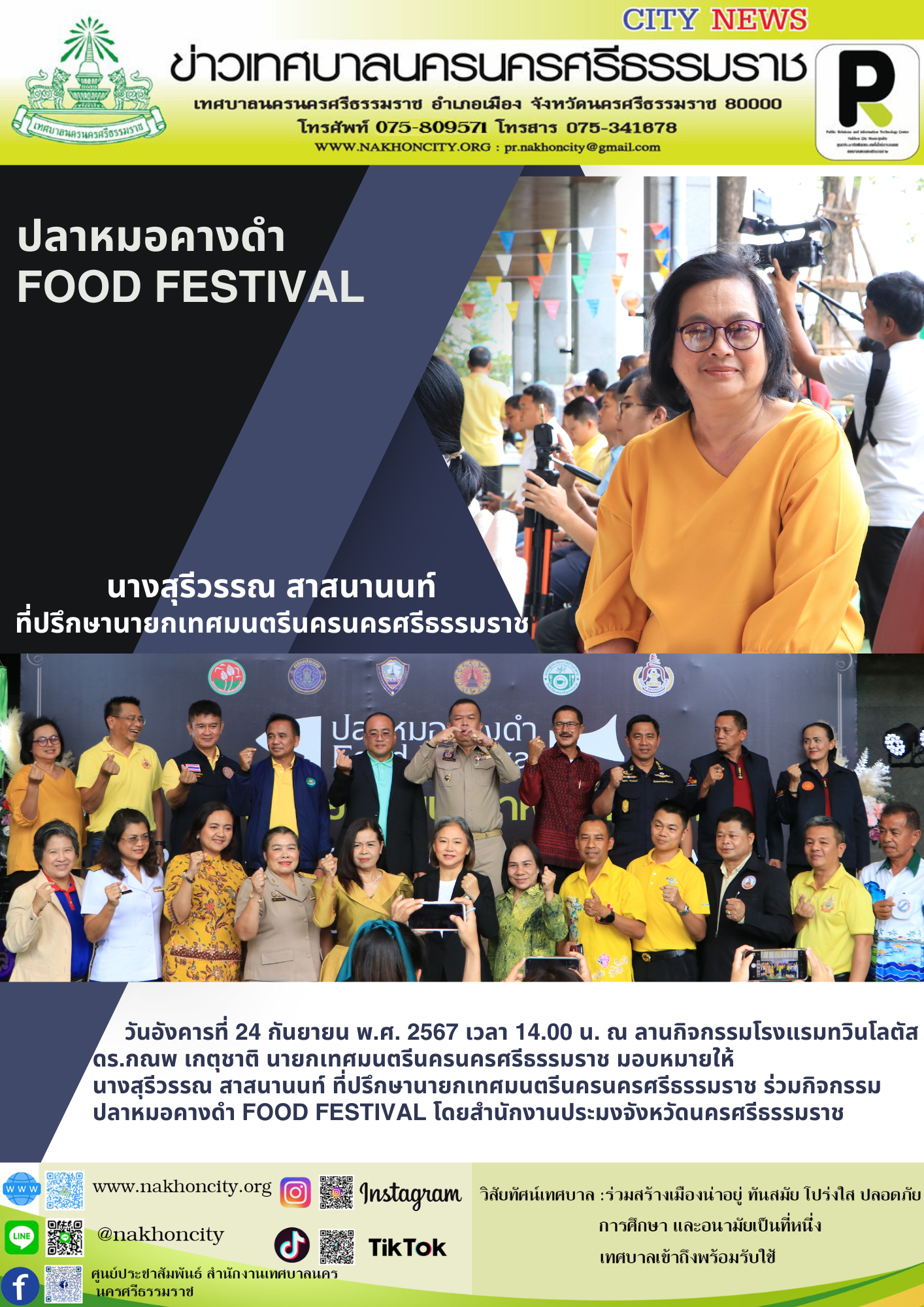 | มอบหมายให้ นางสุรีวรรณ สาสนานนท์ ที่ปรึกษานายกเทศมนตรีนครนครศรีธรรมราช ร่วมกิจกรรม ปลาหมอคางดำ FOOD FESTIVAL โดยสำนักงานประมงจังหวัดนครศรีธรรมราช |
