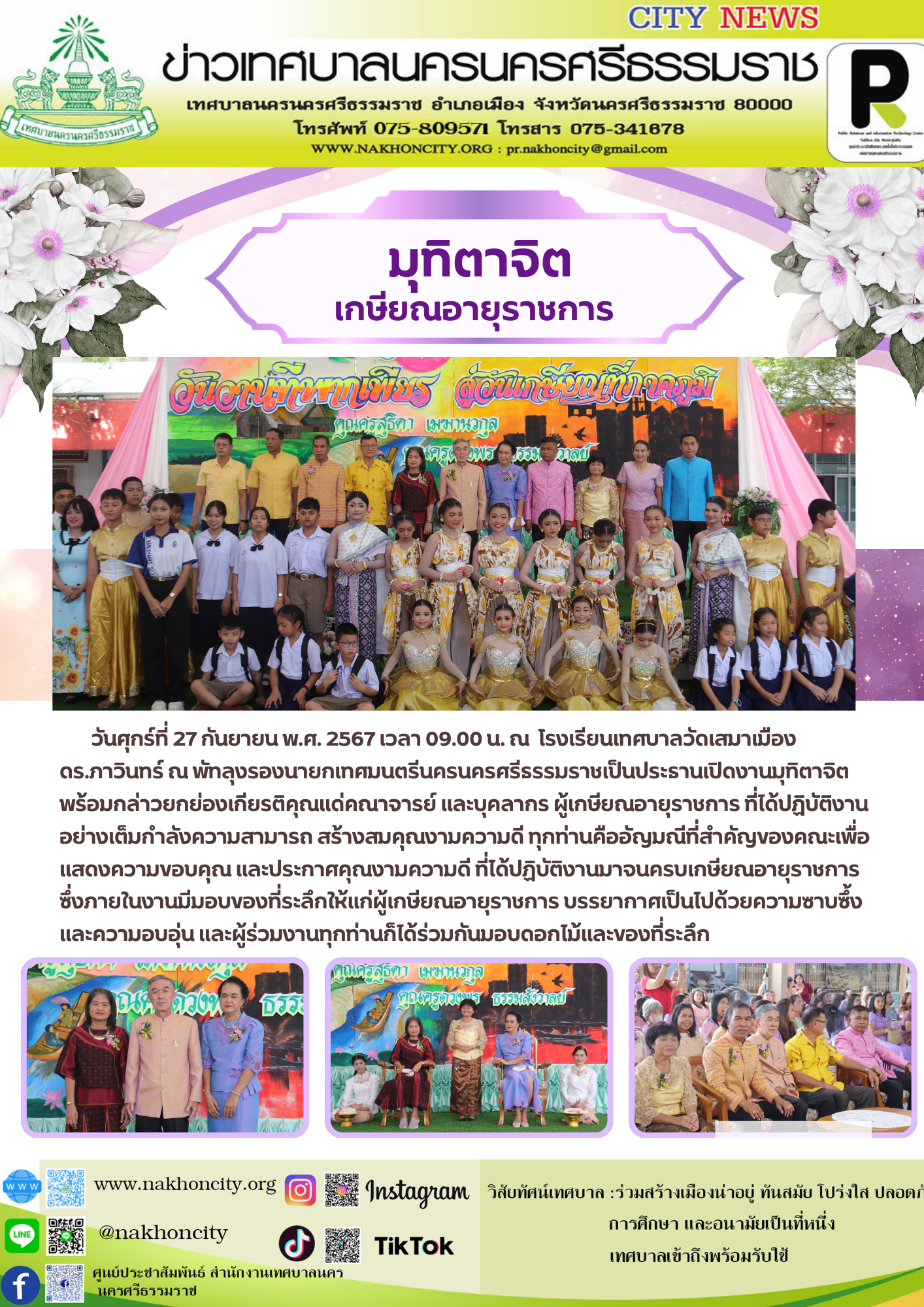 | วันศุกร์ที่ 27 กันยายน พ.ศ. 2567 เวลา 09.00 น. ณ โรงเรียนเทศบาลวัดเสมาเมือง ดร.ภาวินทร์ ณ พัทลุง รองนายกเทศมนตรีนครนครศรีธรรมราช เป็นประธานเปิดงานมุทิตาจิต พร้อมกล่าวยกย่องเกียรติคุณแด่คณาจารย์ และบุคลากร ผู้เกษียณอายุราชการ ที่ได้ปฏิบัติงานอย่างเต็มกำลังความสามารถ สร้างสมคุณงามความดี ทุกท่านคืออัญมณีที่สำคัญของคณะเพื่อแสดงความขอบคุณ และประกาศคุณงามความดี ที่ได้ปฏิบัติงานมาจนครบเกษียณอายุราชการ ซึ่งภายในงานมีมอบของที่ระลึกให้แก่ผู้เกษียณอายุราชการ บรรยากาศเป็นไปด้วยความซาบซึ้งและความอบอุ่น และผู้ร่วมงานทุกท่านก็ได้ร่วมกันมอบดอกไม้และของที่ระลึก |