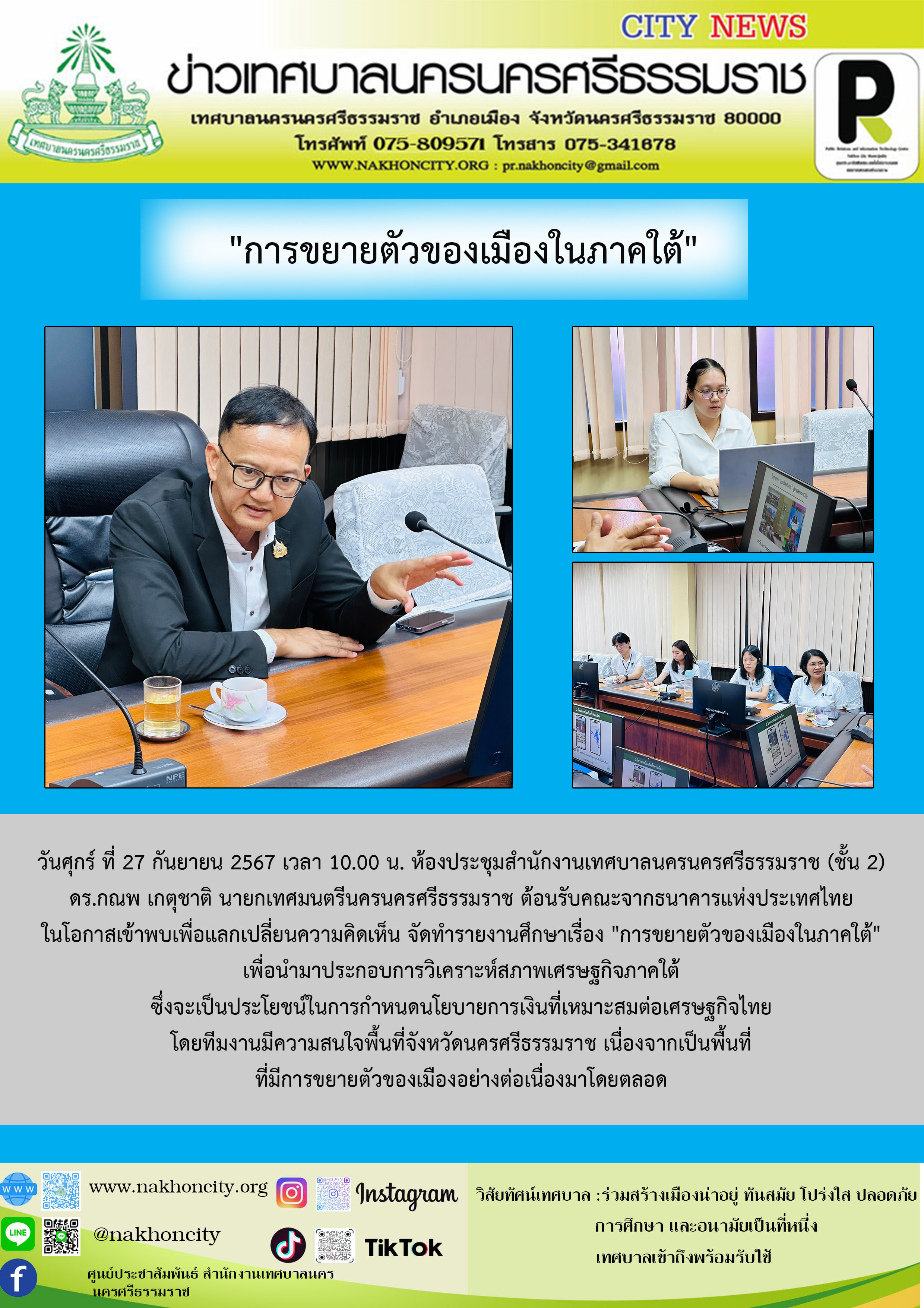 | นายกเทศมนตรีนครนครศรีธรรมราช ต้อนรับคณะจากธนาคารแห่งประเทศไทย ในโอกาสเข้าพบเพื่อแลกเปลี่ยนความคิดเห็น จัดทำรายงานศึกษาเรื่อง "การขยายตัวของเมืองในภาคใต้" |