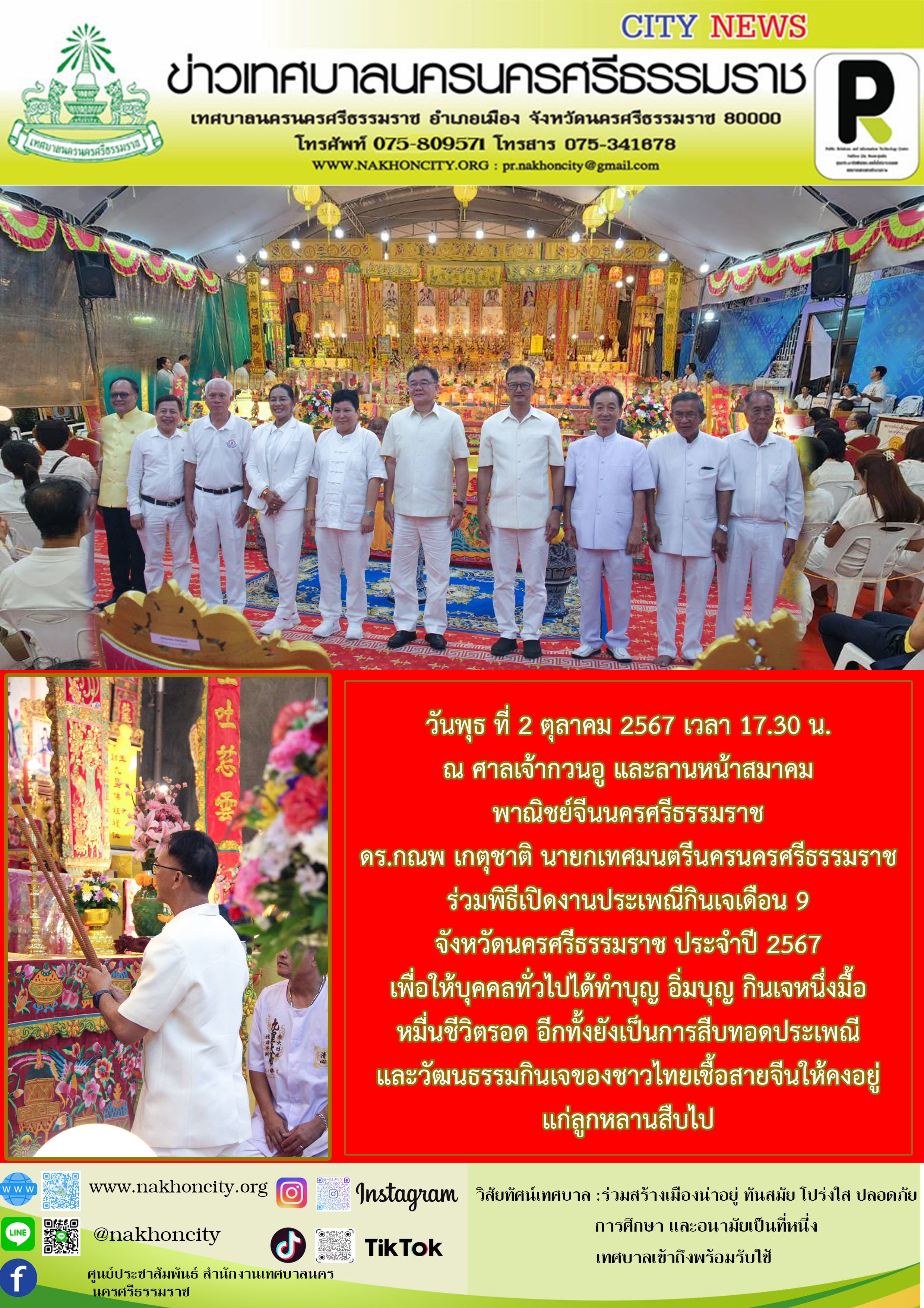 | นายกเทศมนตรีนครนครศรีธรรมราช ร่วมพิธีเปิดงานประเพณีกินเจเดือน 9 จังหวัดนครศรีธรรมราช ประจำปี 2567 |