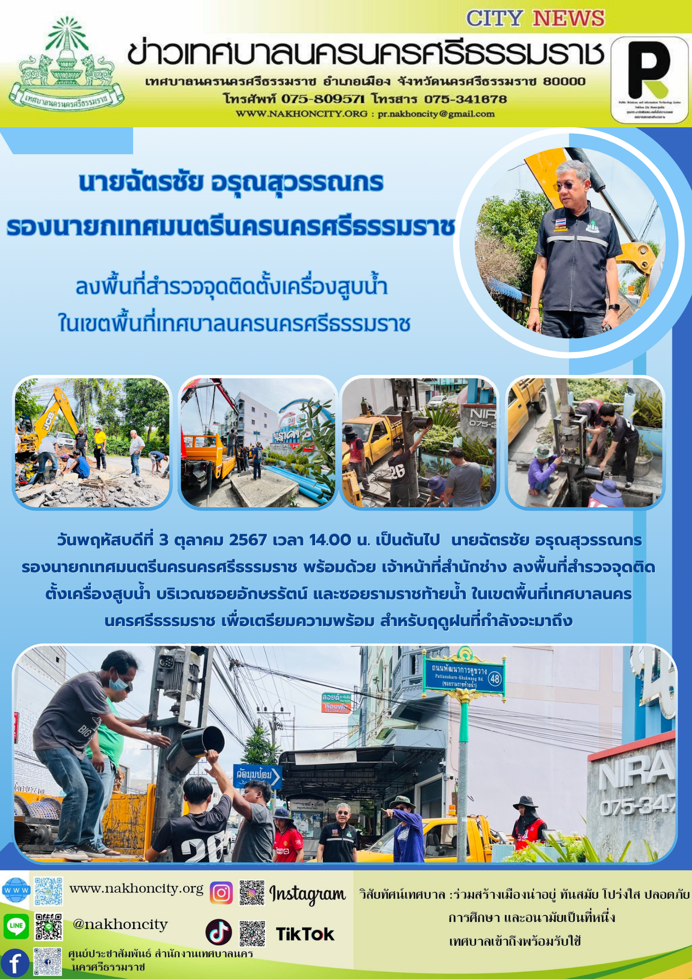| นายฉัตรชัย อรุณสุวรรณกร รองนายกเทศมนตรีนครนครศรีธรรมราช ลงพื้นที่สำรวจจุดติดตั้งเครื่องสูบน้ำ |
