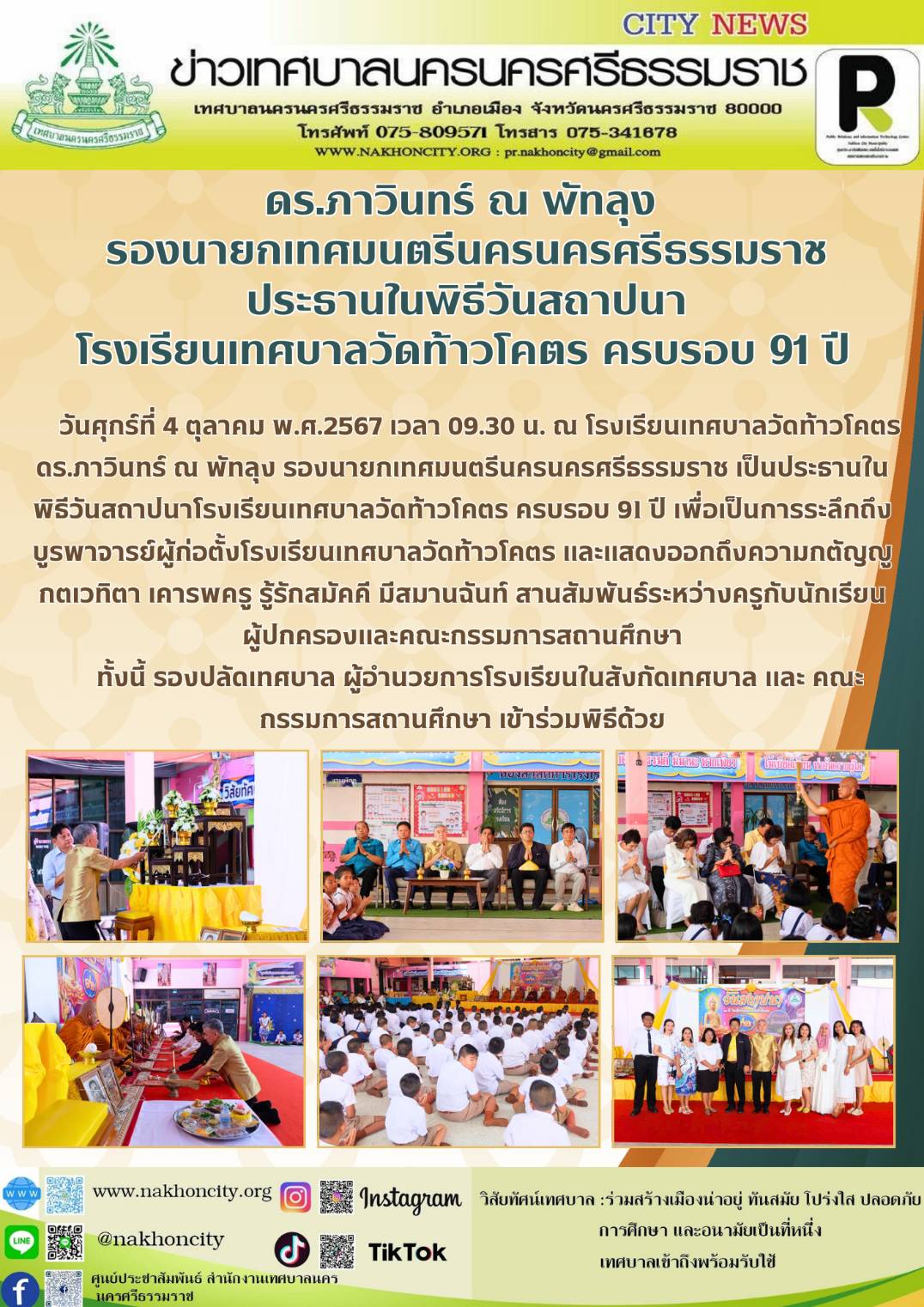 | ดร.ภาวินทร์ ณ พัทลุง รองนายกเทศมนตรีนครนครศรีธรรมราช เป็นประธานในพิธีวันสถาปนาโรงเรียนเทศบาลวัดท้าวโคตร ครบรอบ 91 ปี |