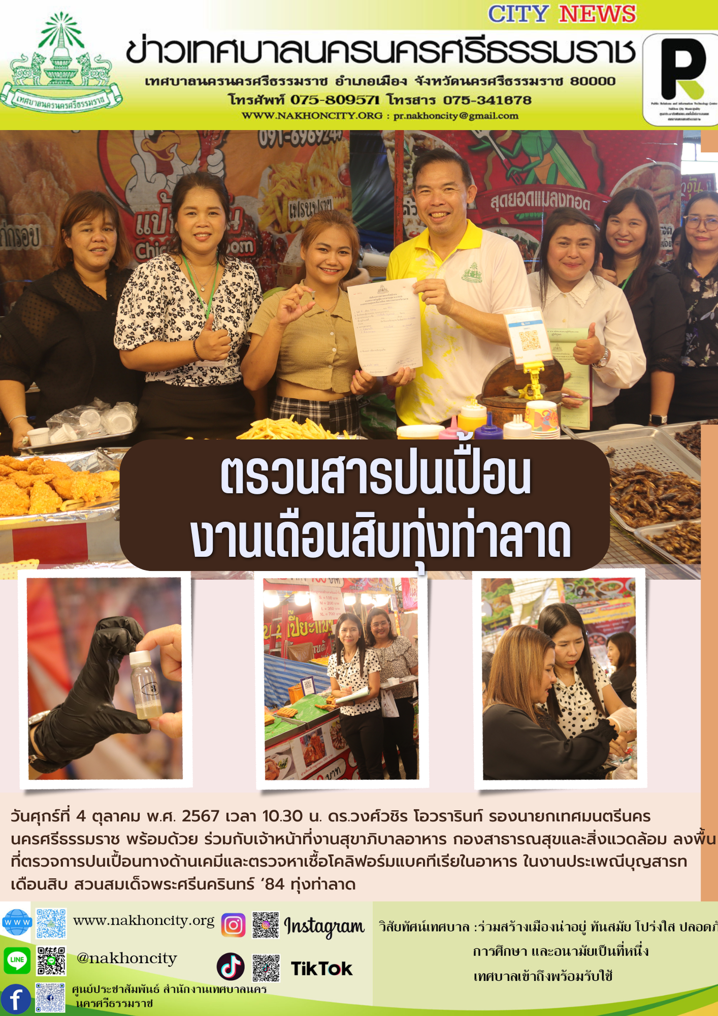 | วันศุกร์ที่ 4 ตุลาคม พ.ศ. 2567 เวลา 10.30 น. ดร.วงศ์วชิร โอวรารินท์ รองนายกเทศมนตรีนครนครศรีธรรมราช พร้อมด้วย ร่วมกับเจ้าหน้าที่งานสุขาภิบาลอาหาร กองสาธารณสุขและสิ่งแวดล้อมเทศบาลนครนครศรีธรรมราช ลงพื้นที่ตรวจการปนเปื้อนทางด้านเคมีและตรวจหาเชื้อโคลิฟอร์มแบคทีเรียในอาหาร ในงานประเพณีบุญสารทเดือนสิบ ทุ่งท่าลาด |