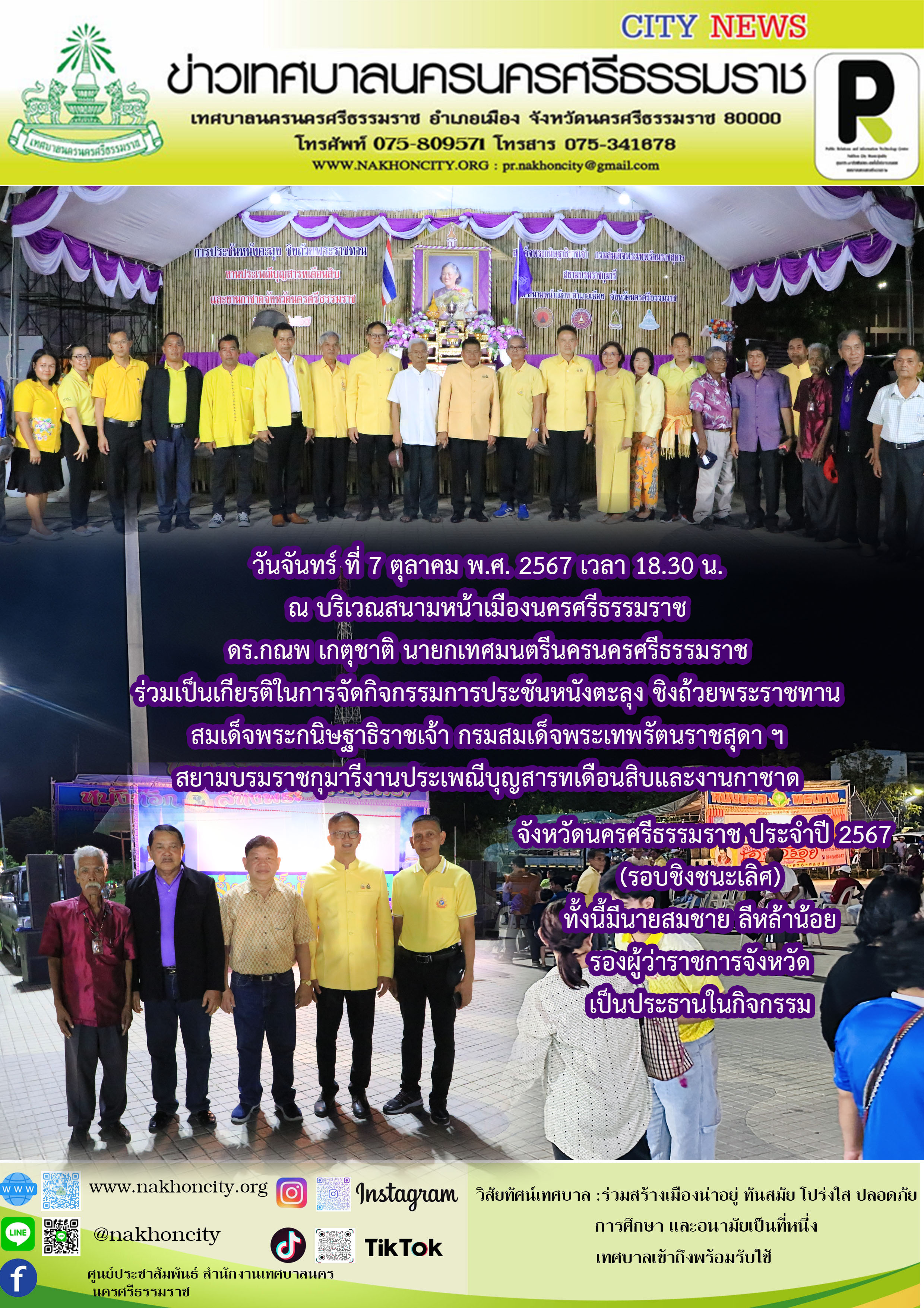 | นายกเทศมนตรีนครนครศรีธรรมราช ร่วมเป็นเกียรติในการจัดกิจกรรมการประชันหนังตะลุง ชิงถ้วยพระราชทาน สมเด็จพระกนิษฐาธิราชเจ้า กรมสมเด็จพระเทพรัตนราชสุดา ฯ สยามบรมราชกุมารี งานประเพณีบุญสารทเดือนสิบและงานกาชาด จังหวัดนครศรีธรรมราช ประจำปี 2567 (รอบชิงชนะเลิศ) |