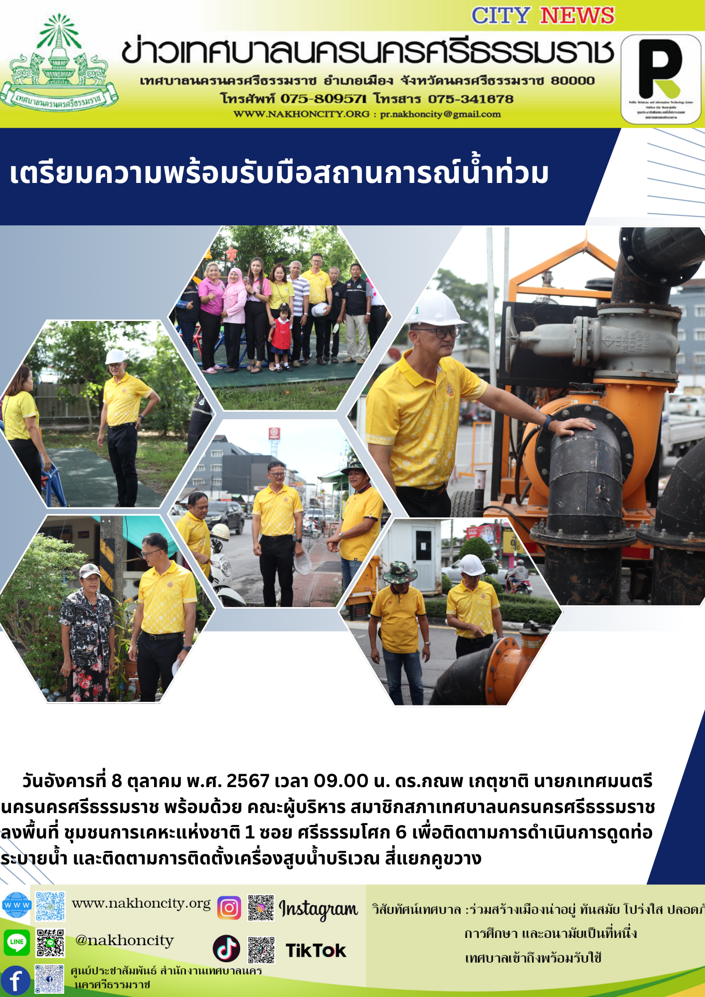 | วันอังคารที่ 8 ตุลาคม พ.ศ. 2567 เวลา 09.00 น. ดร.กณพ เกตุชาติ นายกเทศมนตรีนครนครศรีธรรมราช พร้อมด้วย คณะผู้บริหาร สมาชิกสภาเทศบาลนครนครศรีธรรมราช ลงพื้นที่ ชุมชนการเคหะแห่งชาติ 1 ซอย ศรีธรรมโศก 6 เพื่อติดตามการดำเนินการดูดท่อระบายน้ำ และติดตามการติดตั้งเครื่องสูบน้ำบริเวณ สี่แยกคูขวาง |