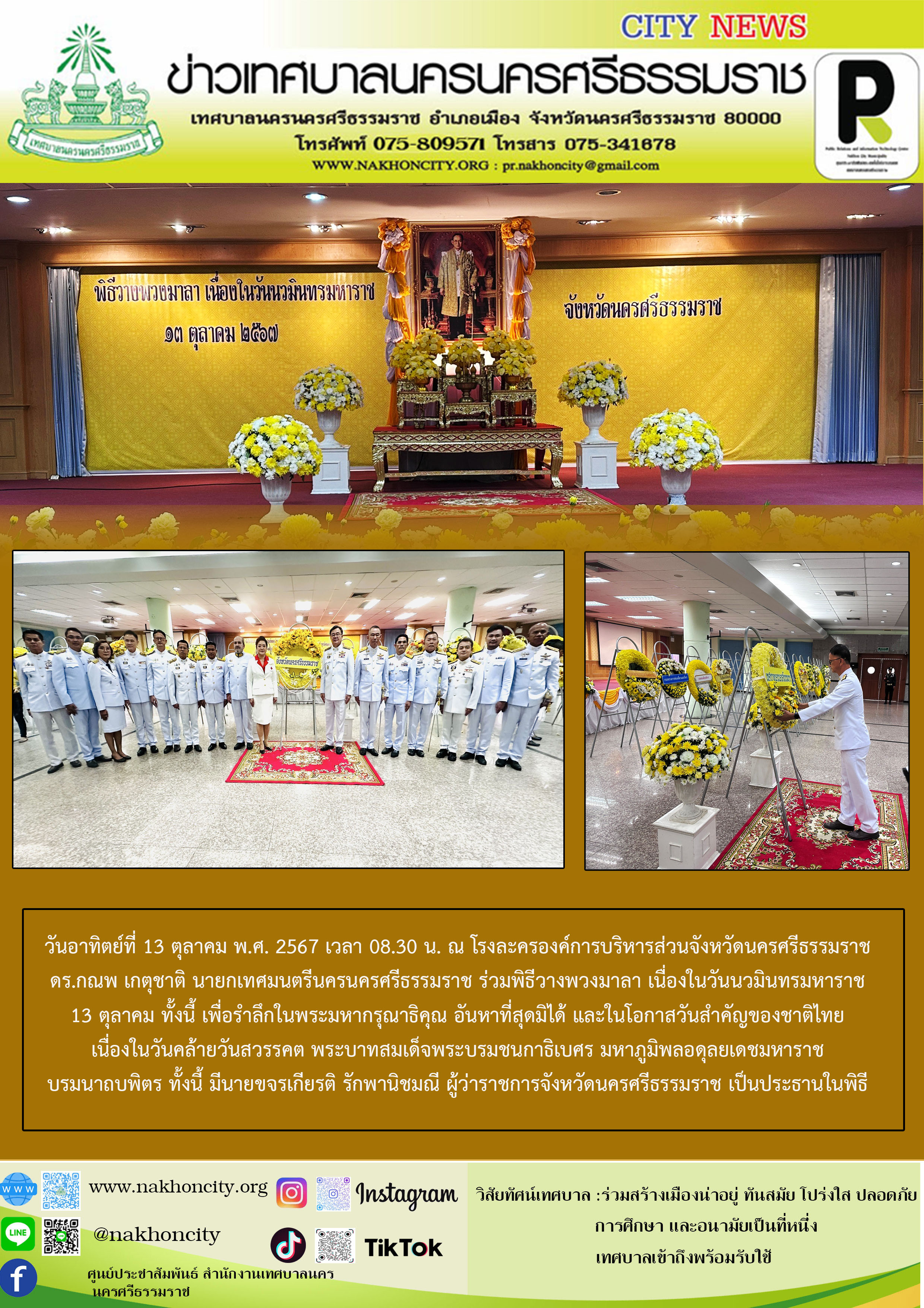 | นายกเทศมนตรีนครนครศรีธรรมราช ร่วมพิธีวางพวงมาลา เนื่องในวันนวมินทรมหาราช 13 ตุลาคม ทั้งนี้ เพื่อรำลึกในพระมหากรุณาธิคุณ อันหาที่สุดมิได้ และในโอกาสวันสำคัญของชาติไทย |