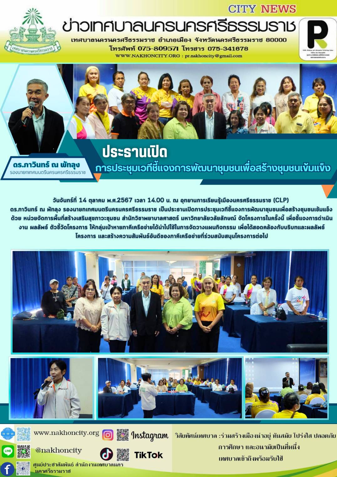 | วันจันทร์ที่ 14 ตุลาคม พ.ศ.2567 เวลา 14.00 น. ณ อุทยานการเรียนรู้เมืองนครศรีธรรมราช (CLP) ดร.ภาวินทร์ ณ พัทลุง รองนายกเทศมนตรีนครนครศรีธรรมราช เป็นประธานเปิดการประชุมเวทีชี้แจงการพัฒนาชุมชนเพื่อสร้างชุมชนเข้มแข็ง ด้วย หน่วยจัดการพื้นที่สร้างเสริมสุขภาวะชุมชน สำนักวิชาพยาบาลศาสตร์ มหาวิทยาลัยวลัยลักษณ์ จัดโครงการในครั้งนี้ เพื่อชี้แจงการดำเนินงาน ผลลัพธ์ ตัวชี้วัดโครงการ ให้กลุ่มเป้าหายภาคีเครือข่ายได้นำไปใช้ในการจัดวางแผนกิจกรรม เพื่อได้สอดคล้องกับบริบทและผลลัพธ์โครงการ และสร้างความสัมพันธ์อันดีของภาคีเครือข่ายที่ร่วมสนับสนุนโครงการต่อไป ............. ภาพ//ข่าว//จันทร์จิรา |