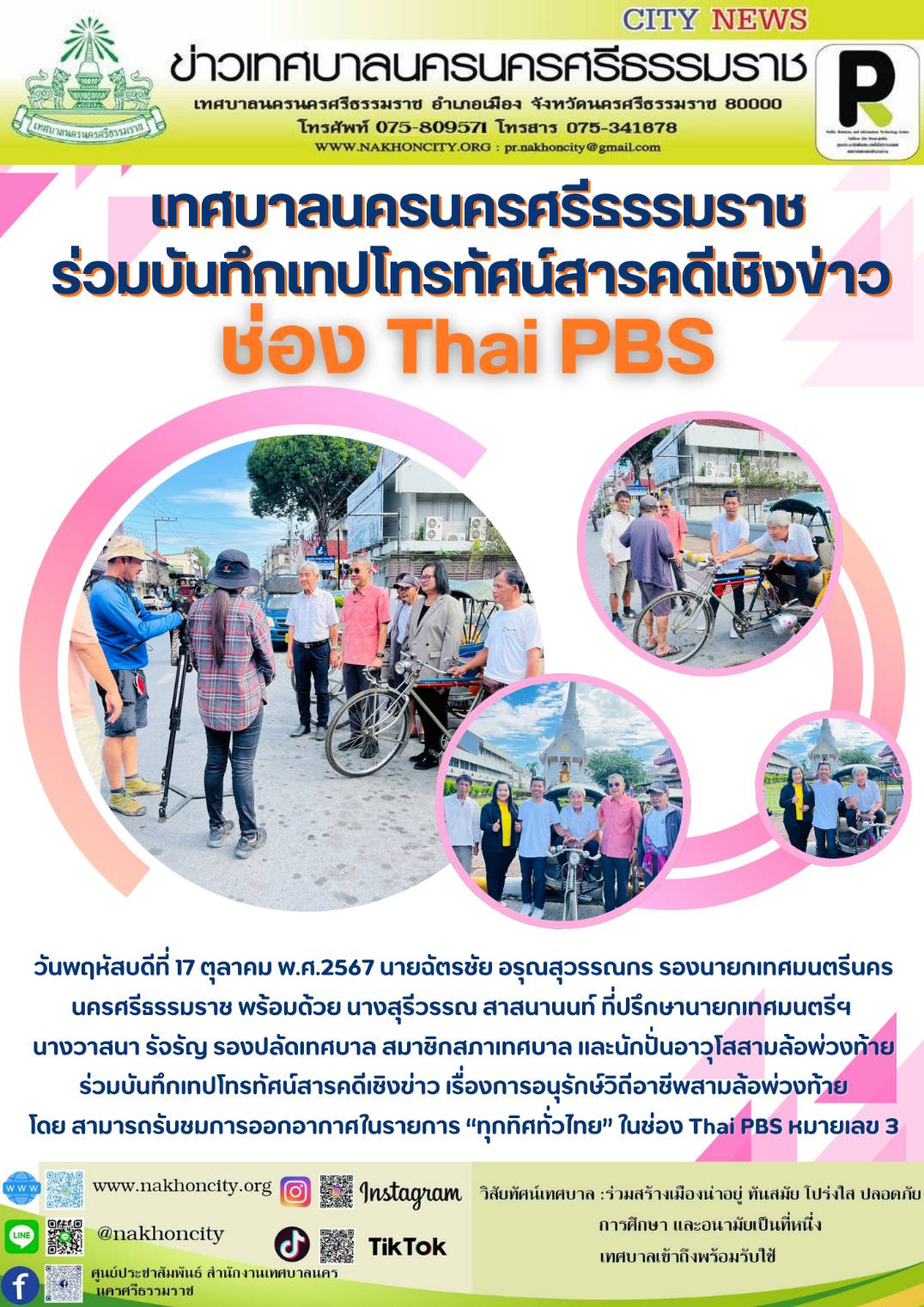 | วันพฤหัสบดีที่ 17 ตุลาคม พ.ศ.2567 นายฉัตรชัย อรุณสุวรรณกร รองนายกเทศมนตรีนครนครศรีธรรมราช พร้อมด้วย นางสุรีวรรณ สาสนานนท์ ที่ปรึกษานายกเทศมนตรีฯ นางวาสนา รัจรัญ รองปลัดเทศบาล สมาชิกสภาเทศบาล และนักปั่นอาวุโสสามล้อพ่วงท้าย ร่วมบันทึกเทปโทรทัศน์สารคดีเชิงข่าว เรื่องการอนุรักษ์วิถีอาชีพสามล้อพ่วงท้าย โดย สามารถรับชมการออกอากาศในรายการ “ทุกทิศทั่วไทย” ในช่อง Thai PBS หมายเลข 3 .......... ข่าว//จันทร์จิรา |