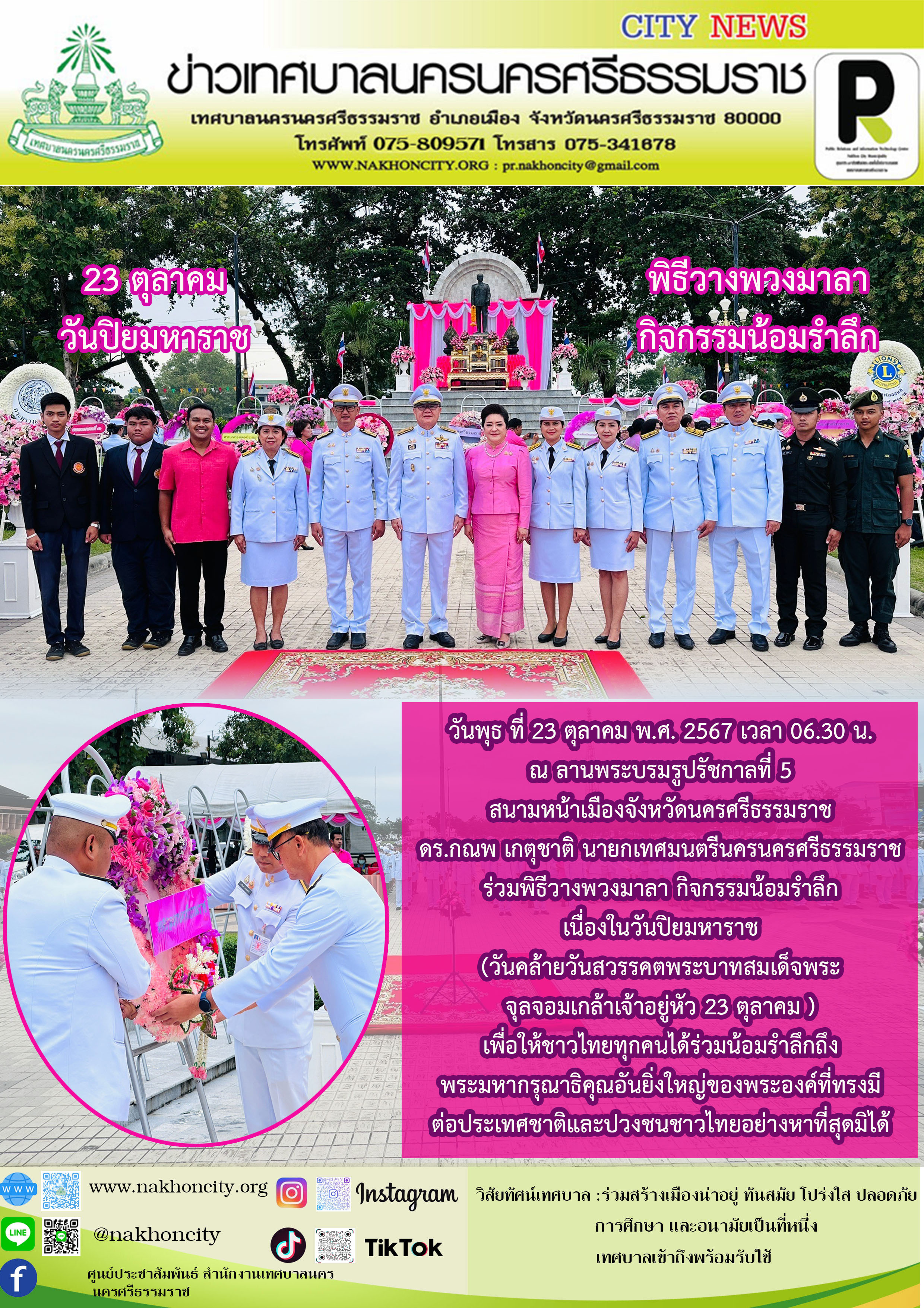 | นายกเทศมนตรีนครนครศรีธรรมราช ร่วมพิธีวางพวงมาลา กิจกรรมน้อมรำลึก เนื่องในวันปิยมหาราช (วันคล้ายวันสวรรคตพระบาทสมเด็จพระจุลจอมเกล้าเจ้าอยู่หัว 23 ตุลาคม ) |